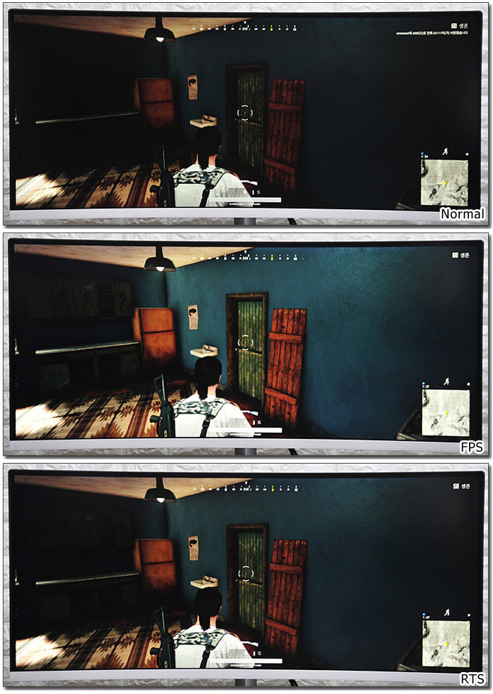300cd/m2 의 높은 밝기를 지원해 대부분의 게임 환경에서 밝은 영상을 즐길 수 있으며 사진과 같이 FPS 와 RTS 모드를 지원해 실내나 야간맵에서도 확연한 구분감을 경험할 수 있다.