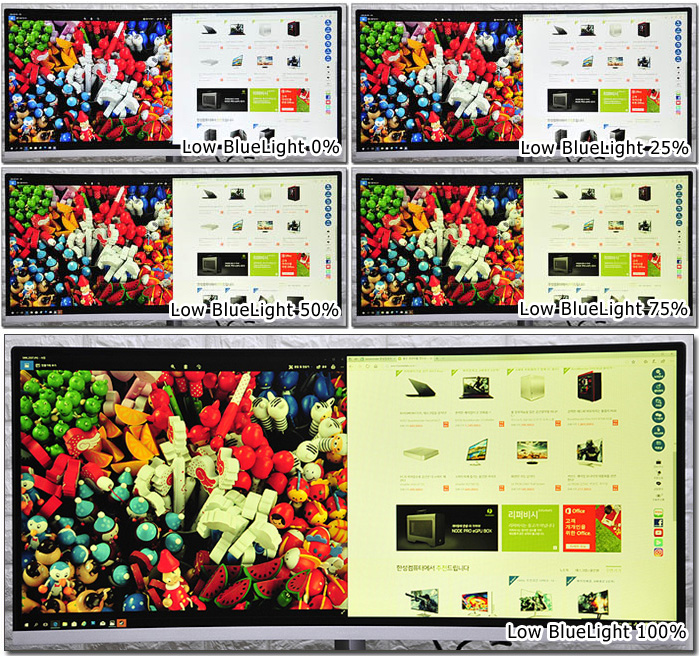 OSD를 통해 블루라이트 감소 기능을 설정할 수 있다. 눈에 않좋은 영향을 미치는 청색광을 억제해 시력을 보호하는 기능으로 장시간 PC를 사용하는 유저들이라면 눈의 피로감을 최소화 하며 작업을 진행할 수 있을 것이다. (게임이나 멀티비디어 감상 보다는 흰색 배경에서 작업이 이루어지는 웹서핑이나 오피스 등에서 사용힐때 큰 효과를 볼 수 있다.)
