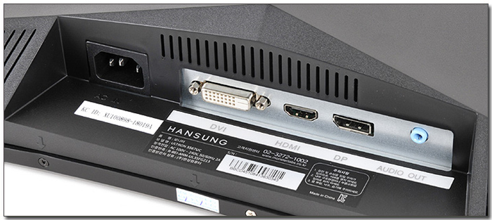 고해상도에 높은 주사율을 지원하는 모델로 다양한 단자부를 지원한다. DP 1.2 와 HDMI 2.0 단자가 설치되어 있고 DVI-D 와 오디오 출력, 전원 단자 등이 설치된 것을 확인할 수 있다.