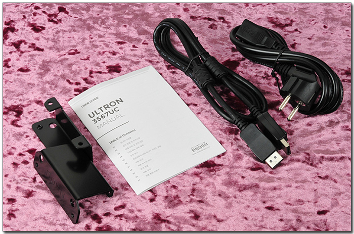 기본 제공되는 액세서리의 모습으로 벽걸이용 마운드 브라켓, 사용설명서가 포함되어 있으며 전원 케이블과 DP케이블도 지원된다.