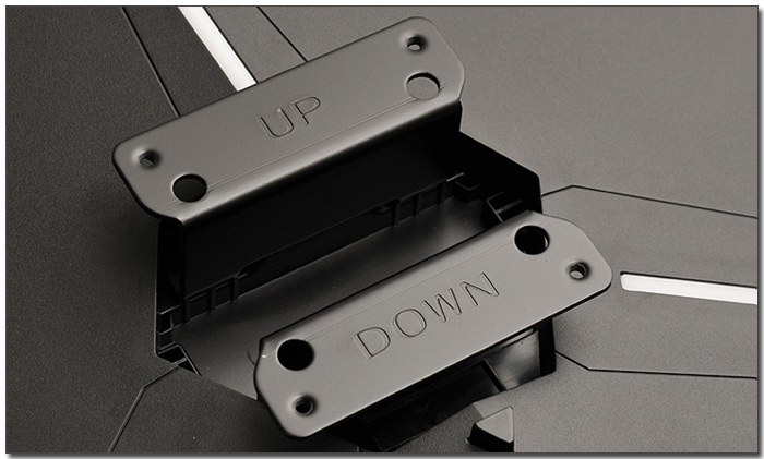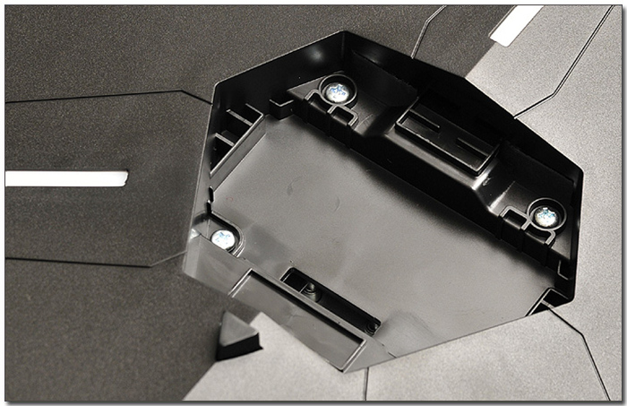 기기 후면부의 모습으로 LED 라이팅 이펙트가 지원되는 것이 눈에 띈다. (OSD를 통해 LED ON/OFF 와 깜박임 등의 효과 설정이 가능하다.) 또한 중앙에는 헤드셋 걸이가 설치되어 있으며 타 제품들과 달리 통풍구는 설치되지 않는 것이 인상적이다.