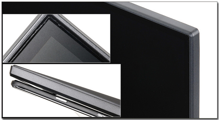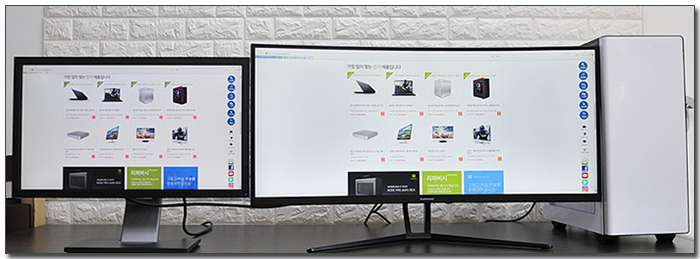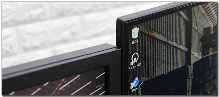 셋팅된 모니터의 패널두께를 비교해 보았는데 사진과 같이 큰 차이가 발생하는 것을 확인할 수 있다. 날렵한 사이즈가 매력적이며 베젤 등으로 인한 답답함 없이 영상을 즐길 수 있었다.