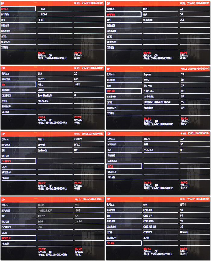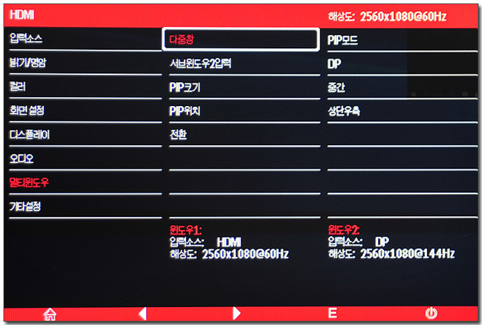 고급형 모델답게 디테일한 설정을 지원하고 있다. 기본적인 밝기와 명암 설정은 물론 화면 모드, 블루라이트 감소, 프리싱크, 멀티윈도우 등의 설정이 가능하다.