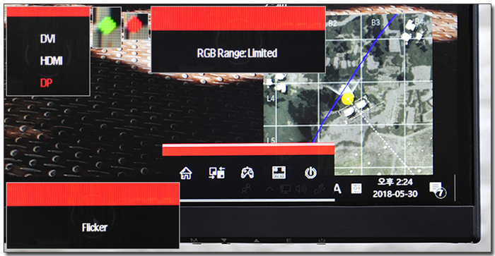 모니터 환경설정을 위한 OSD를 지원한다. 단축키를 통해 입력소스 선택 및 RGB 영역 설정이 가능하며 조준점 및 라이픽 이펙트 설정을 할 수 있다.