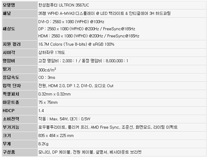 이번에 리뷰를 진행 할 한성컴퓨터 ULTRON 3567UC 는 144Hz 지원 게이밍 모니터와 달리 200Hz 의 높은 주사율을 지원하는 고급형 모델로 매끄럽고 섬세한 게임 플레이가 가능하다. 특히 16:9 비율의 일반 모니터와 달리 21:9 비율을 지원하며 커브드 패널 탑재로 한차원 높은 몰입감을 경험할 수 있다.