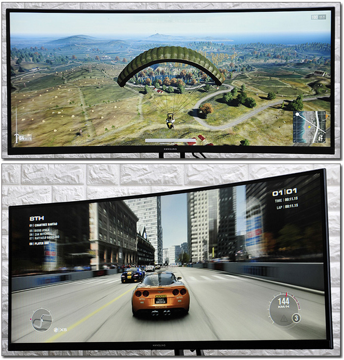 더 넓은 게이밍 영역을 제공하는 것도 큰 장점이라 할 수 있다. 배틀그라운드를 비롯해 레이싱 게임이나 축구 게임 등을 플레이 하면 일반 모니터와는 확연히 다른 시각적 만족감을 경험할 수 있을 것이다.