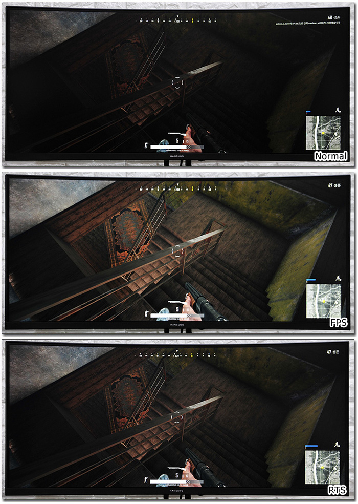 300cd/m2 의 높은 밝기를 지원해 대부분의 게임 환경에서 밝은 영상을 즐길 수 있었다. 또한 게이미 모니터 답게 6가지 화면 프리셋 (기본/게임/RTS/FPS/영화/문서) 을 사용 컨텐츠에 따라 최적의 영상을 구현할 수 있다. 상단의 사진은 기본과 FPS/RTS 모드를 비교한 모습으로 확연히 다른 높은 시인성을 구현해 게임 몰입감을 높일 수 있었다.