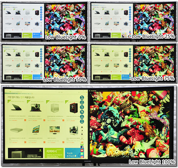 눈건강을 고려해 다양한 기술을 적용한 제품으로 OSD를 통해 블루라이트 감소 기능을 설정할 수 있다. 눈에 않좋은 영향을 미치는 청색광을 억제해 시력을 보호하는 기능으로 장시간 PC를 사용하는 유저들이라면 눈의 피로감을 최소화 하며 작업을 진행할 수 있을 것이다. (게임이나 멀티비디어 감상 보다는 흰색 배경에서 작업이 이루어지는 웹서핑이나 오피스 등에서 사용힐때 큰 효과를 볼 수 있다.)