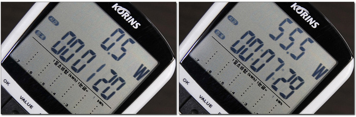 소비전력 테스트를 진행하고 있는 모습으로 대기 상태에서는 0.5W 가 표시되었으며 100% 밝기에서는 55.5W, 50% 밝기에서는 40W 의 전력이 소모되는 것을 확인할 수 있었다. 20형대 모델 보다는 전력소비가 많지만 부담스러운 수준은 아니었다.