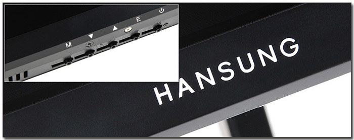 전면 하단부의 모습으로 중앙에는 한성 마크가 세겨져 있으며 우측에는 OSD 버튼이 설치되어 모니터의 주요 기능을 손쉽게 설정할 수 있다.
