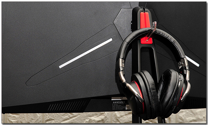 깔끔한 디자인의 스탠드가 장착되어 있으며 상단에서 말씀드린 것과 같이 헤드셋 걸이가 설치되어 너저분한 케이블 등으로 인해 책상에 놓아두기 힘든 헤드셋을 간편하게 보관할 수 있다.