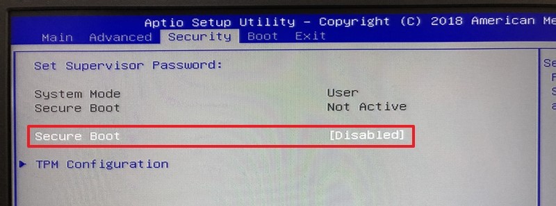 Security 탭으로 이동하여 Secure Boot를 Disabled로 바꿔 주시고