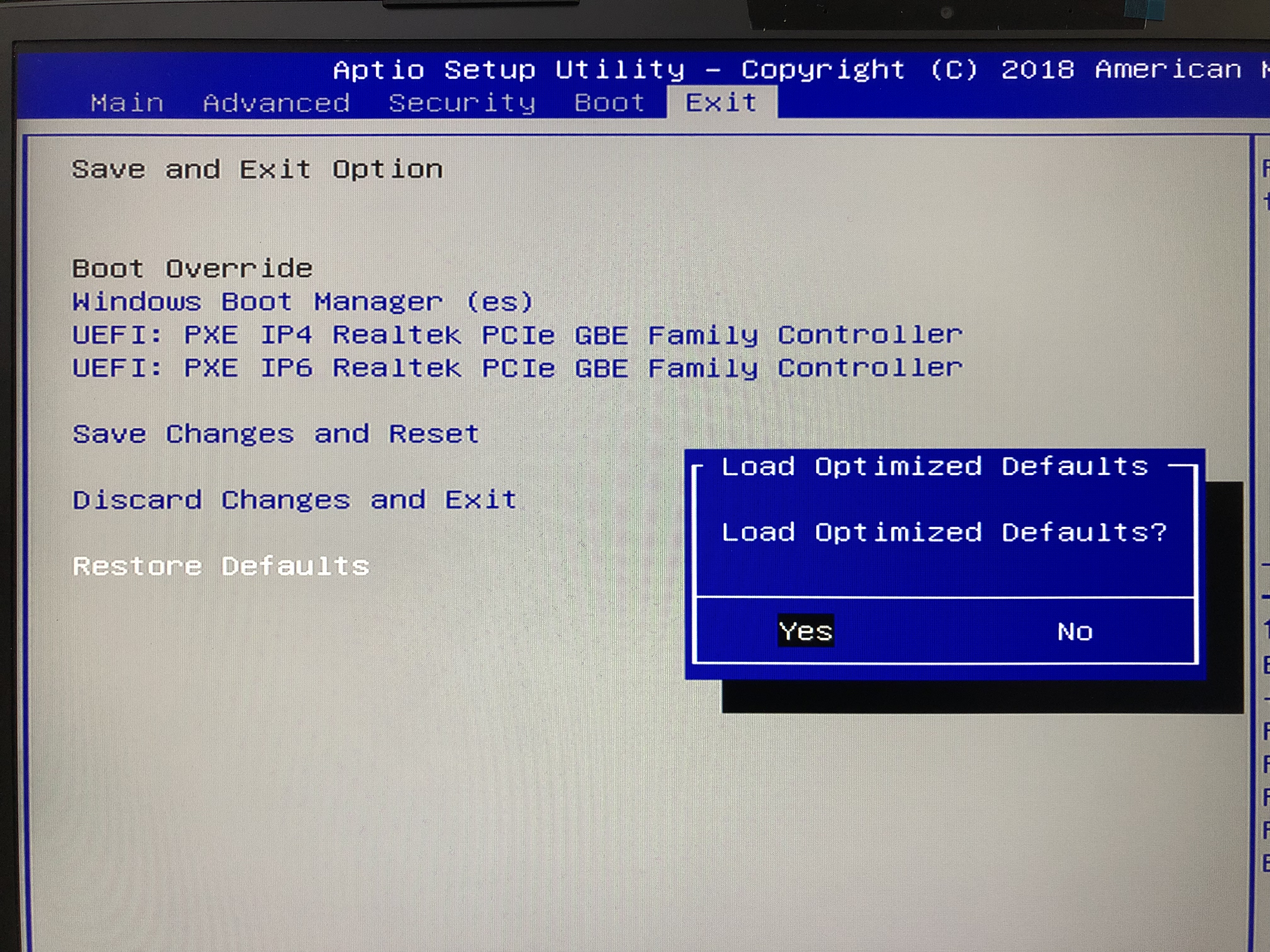 Exit탭으로 이동하여 Save Changes and Reset - Yes를 선택하여 재부팅 합니다.