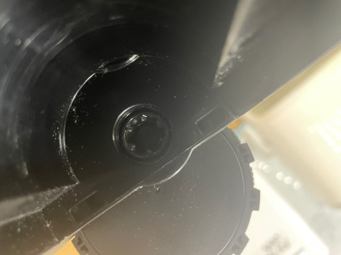 1) 청소기를 뒤집어 앞바퀴 고정부 틈 사이에 얇은 도구를 사용하여, 지렛대 형식으로 들어올려서 분리합니다.