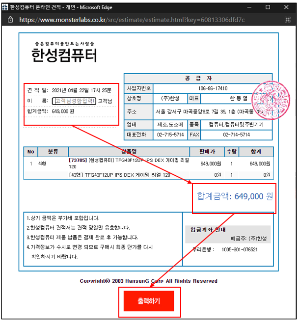 3. [고객님 성함]은 수기입력이 가능하며, 합계 금액 확인 후 [견적서] 출력 진행가능합니다.