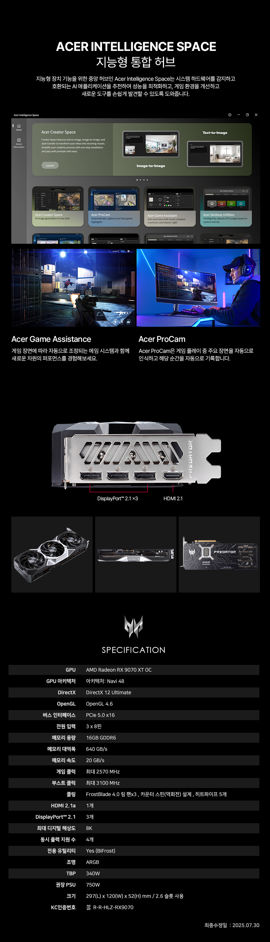 | 품명 및 모델명 | [한성] 에이서 PREDATOR 라데온 RX 9070 XT BiFrost OC D6 16GB | 제조사(수입자/병행수입) | 에이서 |