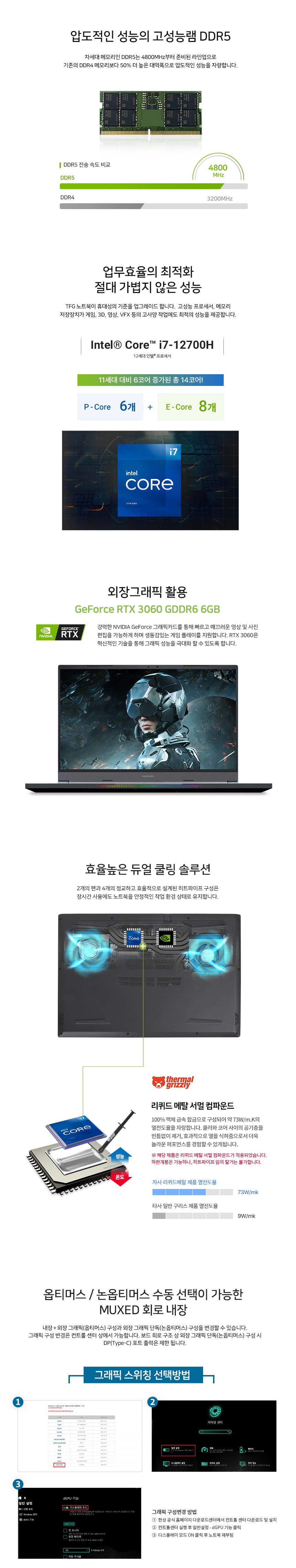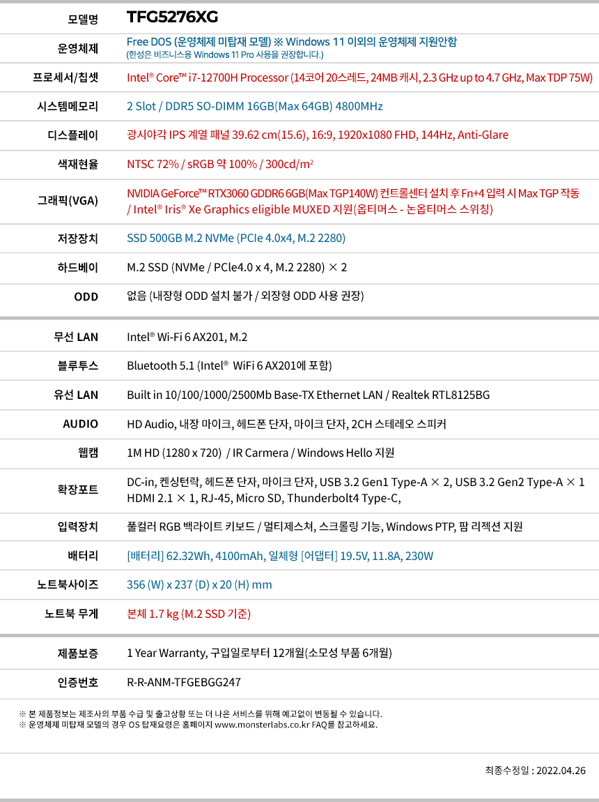 | 제품 주요 사양 | i7-12700H/RTX3060/DDR5 16GB/SSD NVMe 500GB/Free Dos | 크기,무게 | 상품설명 참조 |