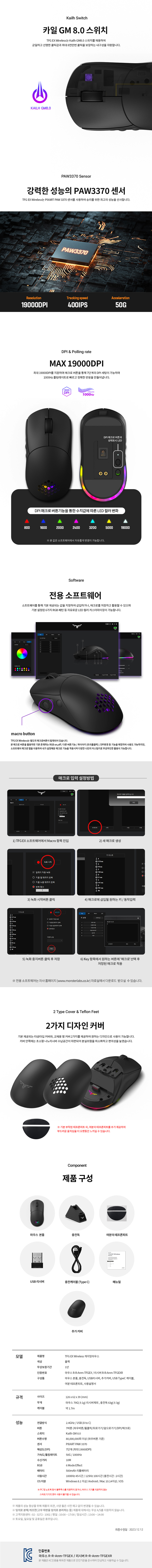 | 제품 주요 사양 | 상세페이지참조 | 크기,무게 | 크기 - 126x62x39 (mm) / 무게 - 마우스 : 79g 리시버제외 (±1g) , 충전독 : 63g |