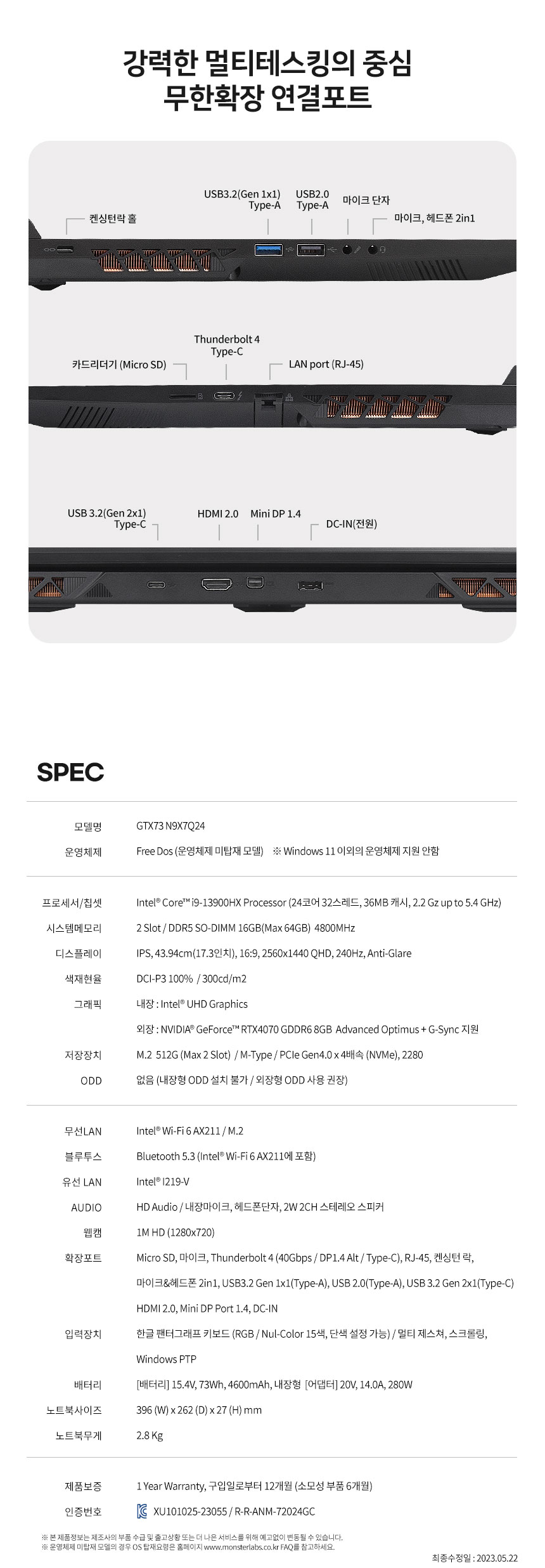 | 제품 주요 사양 | i9-13900HX/RTX4070/DDR5 16GB/SSD NVMe 500GB/Free Dos | 크기,무게 | 상품설명 참조 |