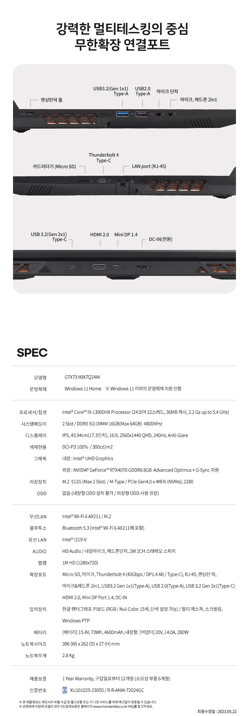 | 제품 주요 사양 | i9-13900HX/RTX4070/DDR5 16GB/SSD NVMe 500GB/Win11 | 크기,무게 | 상품설명 참조 |