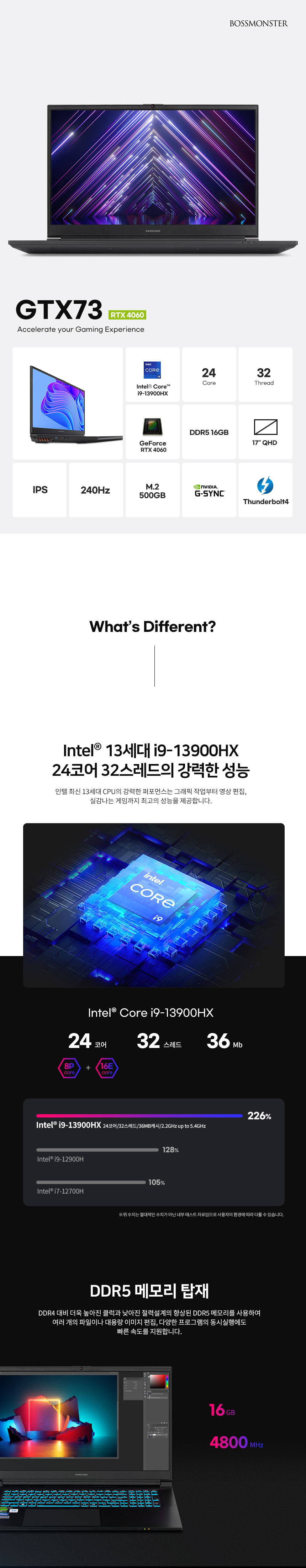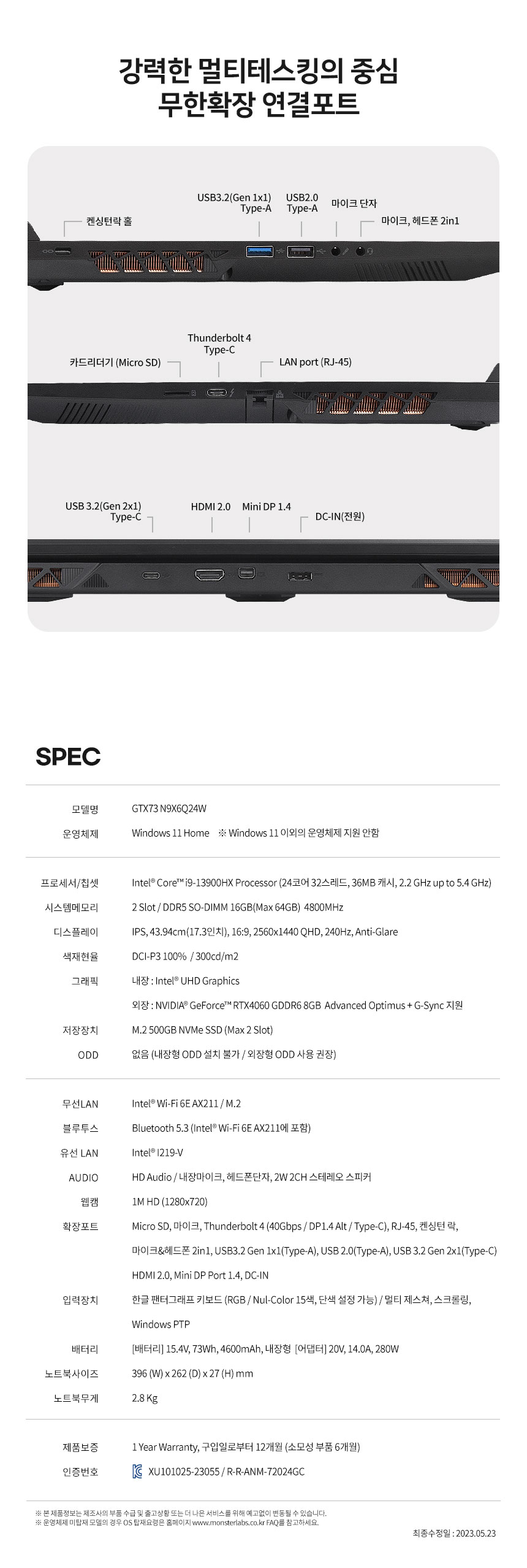 | 제품 주요 사양 | i9-13900HX/RTX4060/DDR5 16GB/SSD NVMe 500GB/Win 11 | 크기,무게 | 상품설명 참조 |