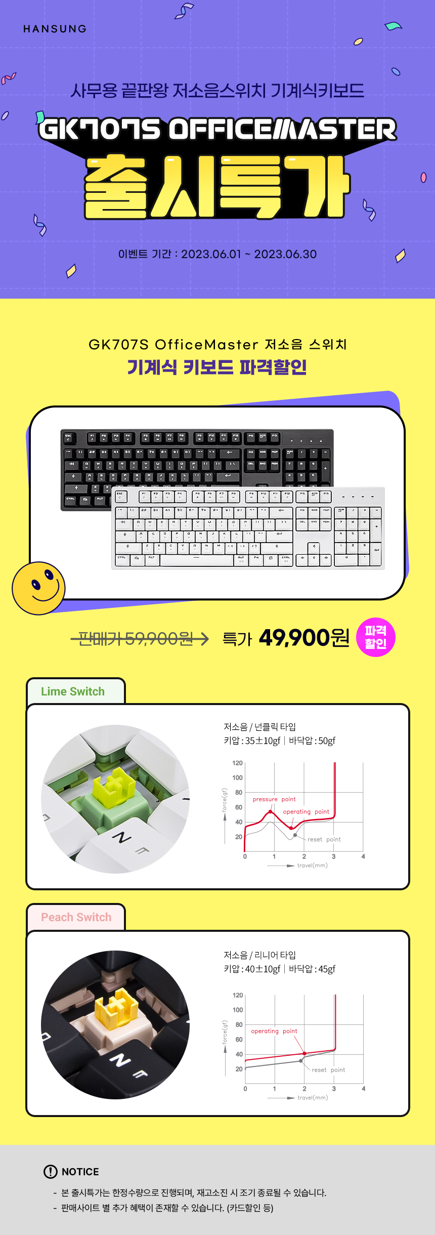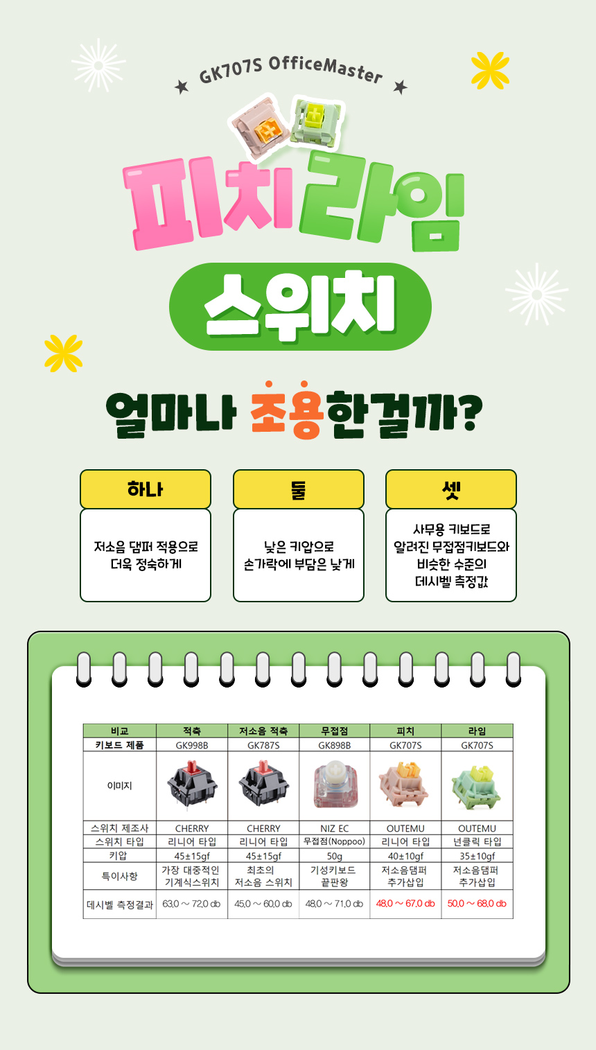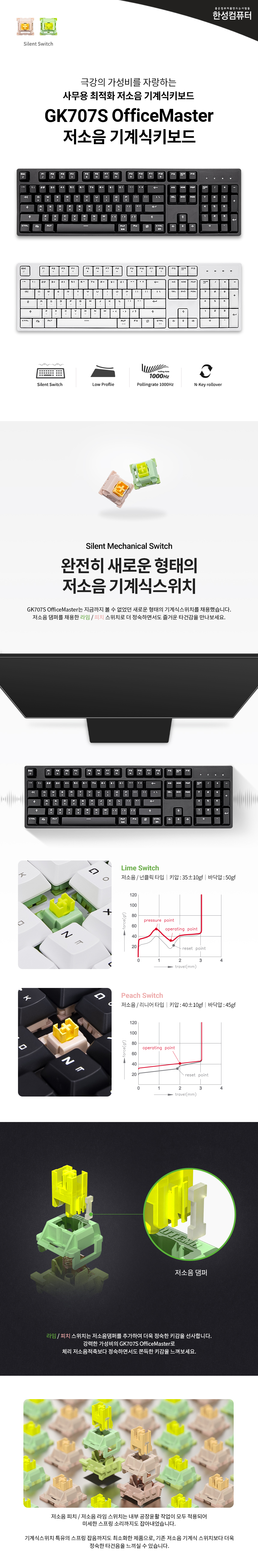 | 품명 및 모델명 | GK707S OfficeMaster 저소음 기계식키보드 (저소음 피치/저소음 라임) | 제조사(수입자/병행수입) | 한성컴퓨터 |