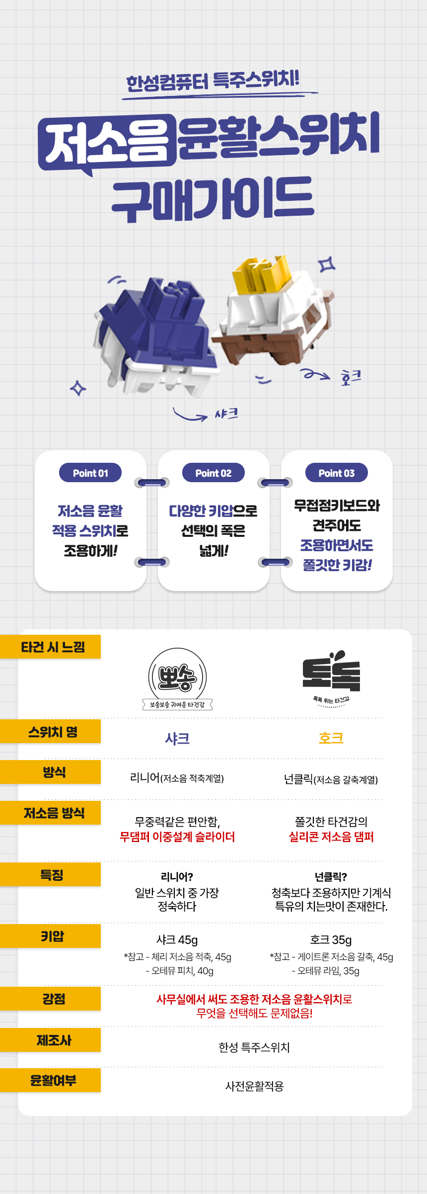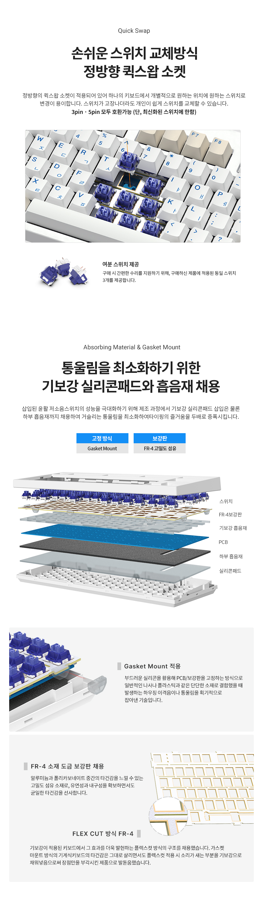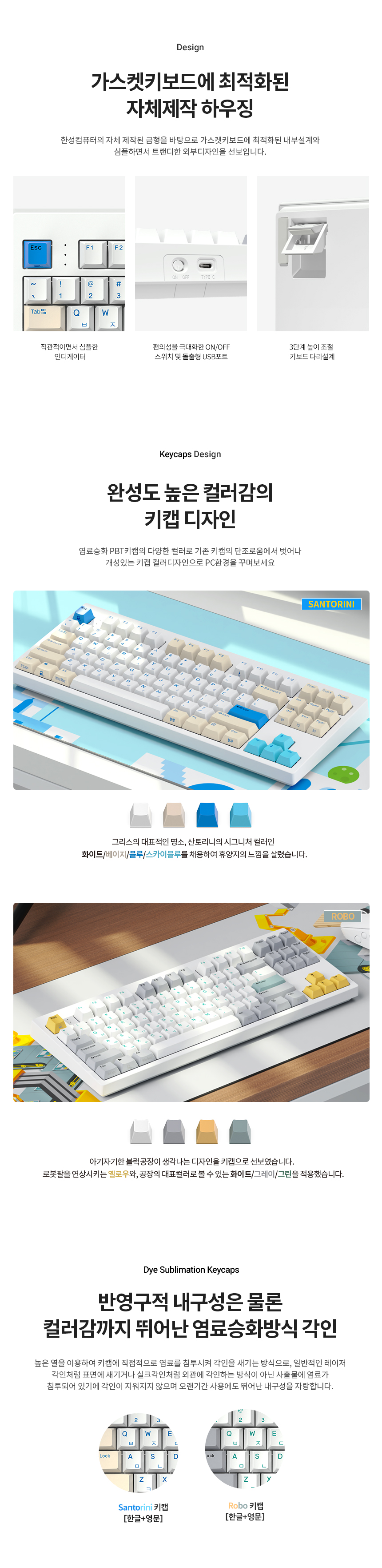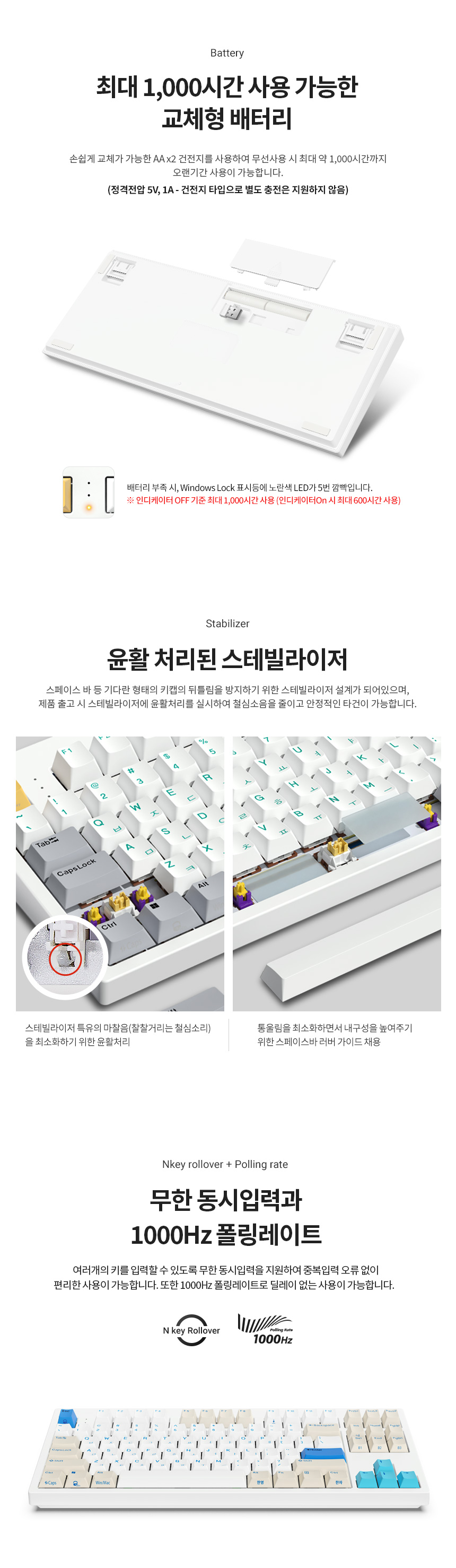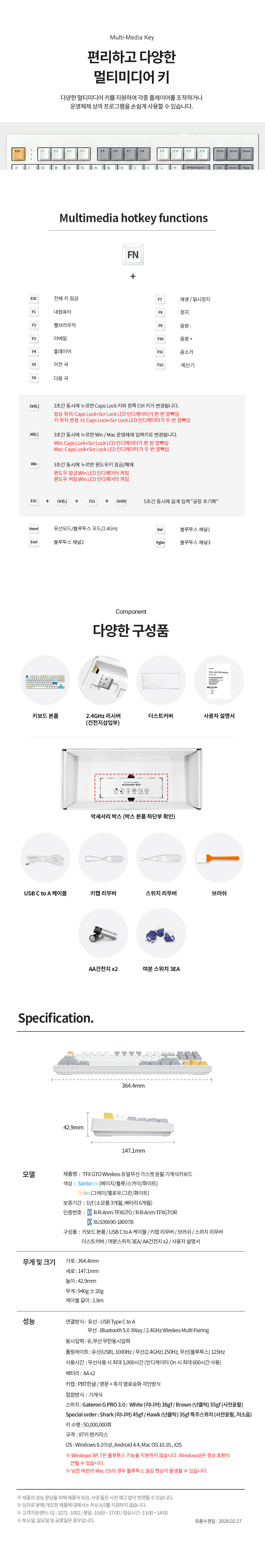 - 타입 : 기계식키보드 - 규격 : 87키 텐키리스 - 키캡/각인 : PBT 한글/영문 + 측각 염료승화 각인 - 고정 방식 : 가스켓 마운트 적용 - 흡음재 : 기보강 실리콘 패드 삽입 / FR-4 고밀도 섬유 소재 보강판 채용 - 동시입력 : 유/무선 무한동시입력 지원 - 폴링레이트 : 유선(USB) 1000Hz / 무선(2.4GHz) 250Hz, 무선(블루투스) 125Hz - 배터리 : AA건전지 * 2개 - 사이즈 : 364.4 x 147.1 x 42.9mm - 무게 : 940g±20 - 케이블 길이 : 1.8m - 연결방식 : 유선-USB Type C to A / 무선-Bluetooth5.0 3way / 2.4GHz 리시버 - 사용시간 : 무선사용 시 최대 1,000시간(인디케이터 On시 최대 600시간 사용) - 구성품 : 키보드본품,리시버,USB C to A,사용자설명서,키캡리무버,스위치리무버,브러쉬,더스트커버,여분스위치 3EA - 스위치 : Gateron G PRO 3.0(사전윤활) - [White (리니어) 38gf], [Brown (넌클릭) 55gf] / Special order(사전윤활, 저소음) - [Shark (리니어) 45gf], [Hawk (넌클릭) 35gf] - 색상 : Santorini/Robo | 0원 |