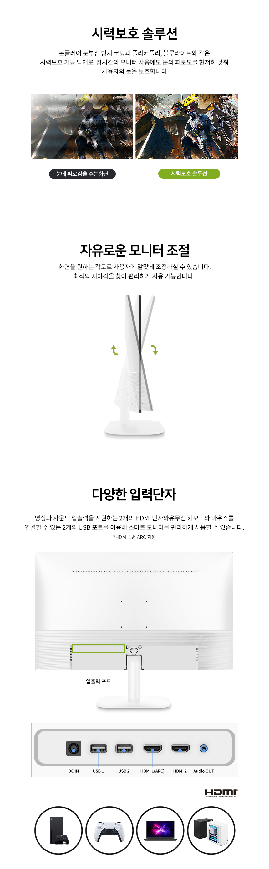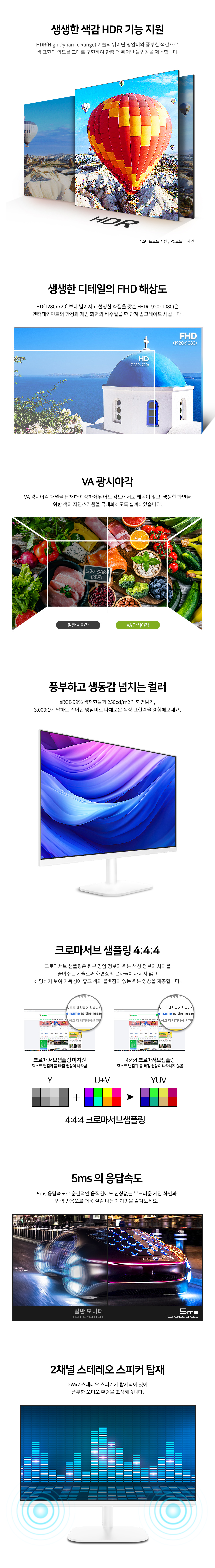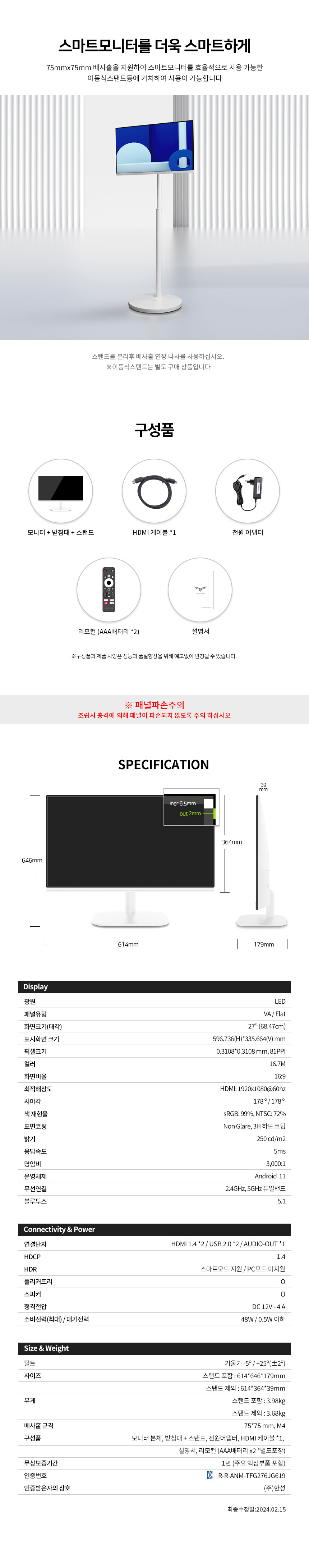 - 일반/무결점 선택가능 - 68.47cm(27인치) / 와이드(16:9) / VA / 평면 / 광시야각 - 1920 x 1080(FHD) / 픽셀피치: 0.3108mm / 60Hz / 5ms - 250cd / 3,000:1 / 플리커 프리 / 블루라이트 차단 / 눈부심 방지 - 크로마서브샘플링 / HDR / 스피커 / Wi-Fi(무선) / 블루투스 / 스마트TV - 크기(가로x세로x깊이): 614x646x179mm / 3.98kg - [색상영역] NTSC: 72% / sRGB: 99% - [단자정보] HDMI | 0원 |