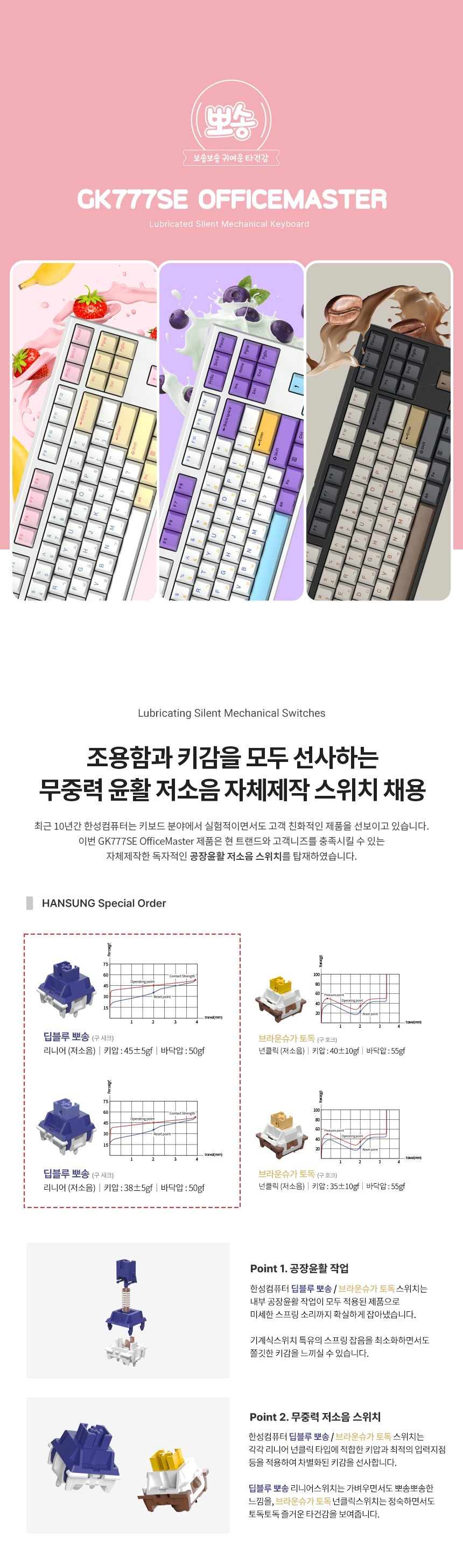 | 품명 및 모델명 | GK777SE OfficeMaster 저소음 윤활 기계식 키보드 뽀송 | 제조사(수입자/병행수입) | (주)한성 |