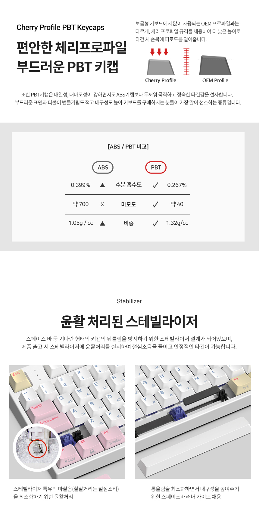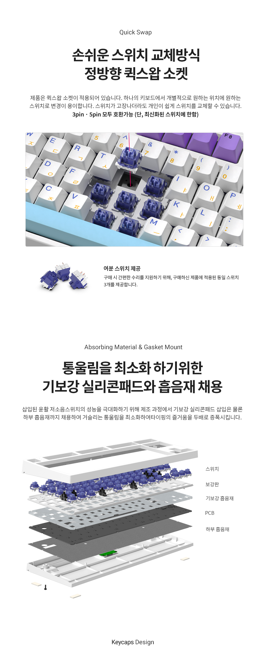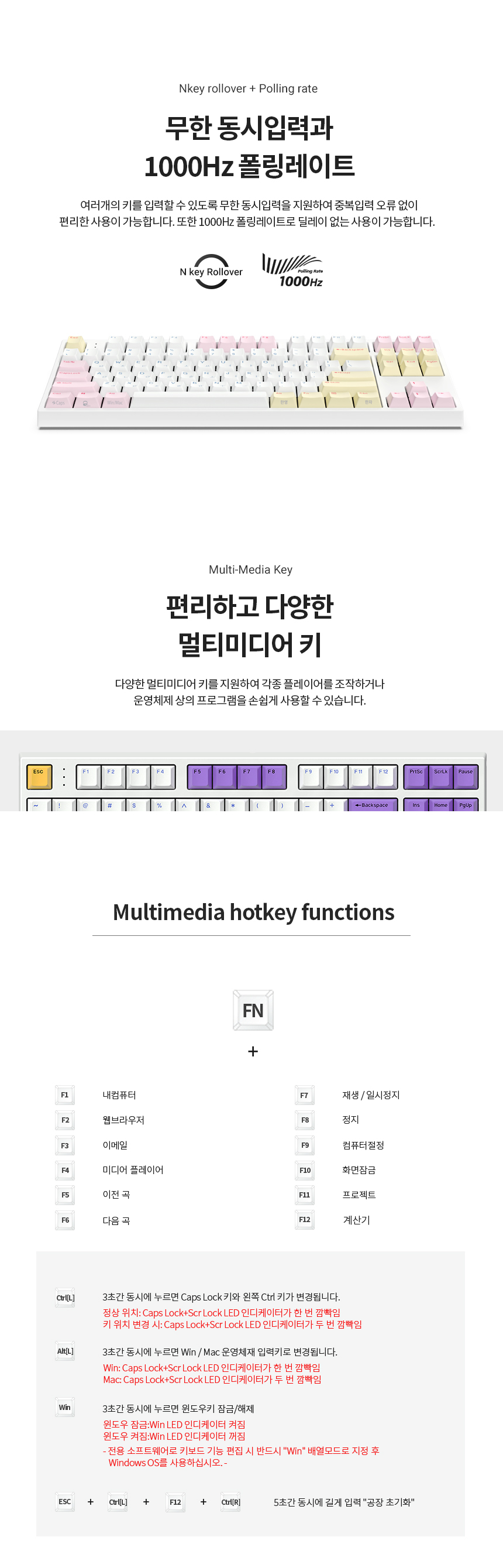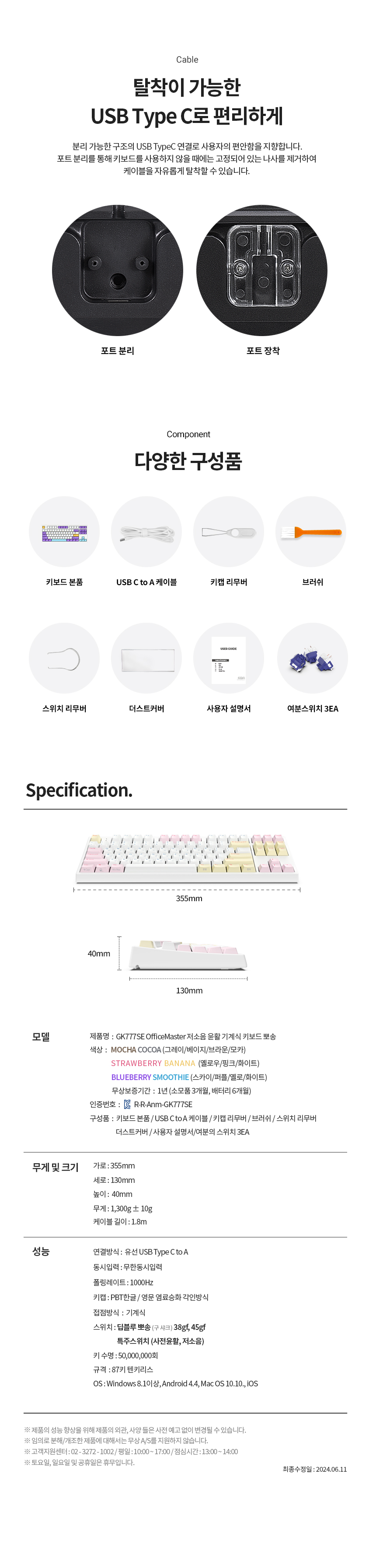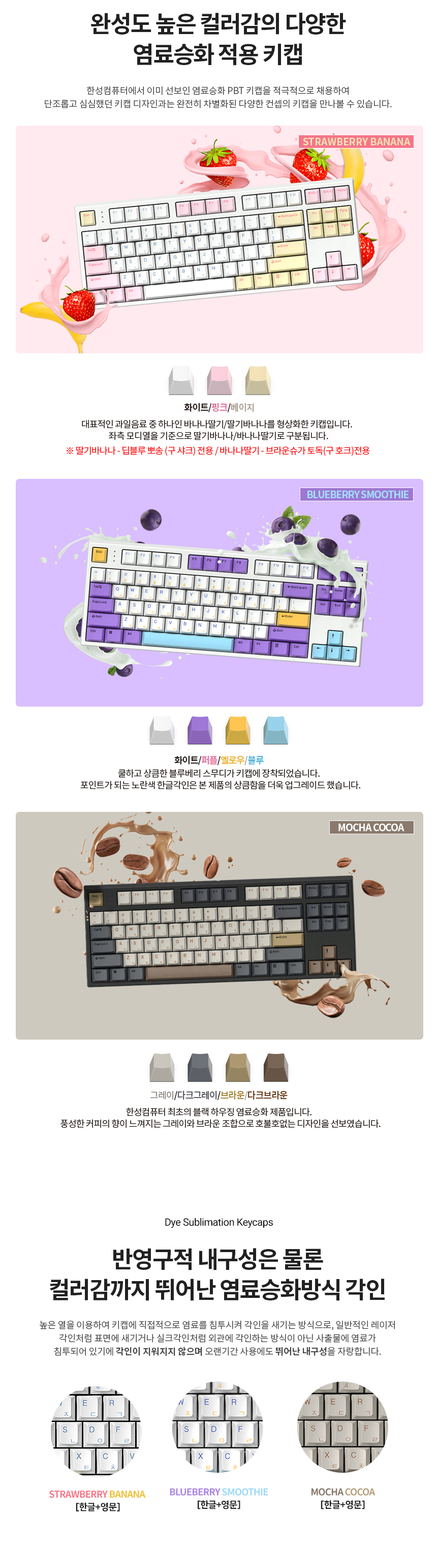 - 타입 : 기계식키보드 - 규격 : 87키 텐키리스 - 연결방식 : 유선 USB Type C to A - 키캡 : PBT한글 / 영문 염료승화 각인방식 - 동시입력 : 무한동시입력 - 폴링레이트 : 1000Hz - 스위치 : 딥블루 뽀송_38g(리니어) 38gf,45gf 특주스위치 (사전윤활,저소음) - 핫스왑 : 3pin, 5pin 호환 가능(단, 최신화된 스위치에 한함) - 구성품 : 키보드 본품 / USB C to A 케이블 / 키캡 리무버 / 브러쉬 / 스위치 리무버 / 더스트커버 / 사용자 설명서 - 사이즈 : 355 x 130 x 40mm - 무게 : 1,300g ± 10g - 케이블 길이 : 1.8m - 색상 : MOCHA COCOA / STRAWBERRY BANANA / BLUEBERRY SMOOTHIE | 0원 |