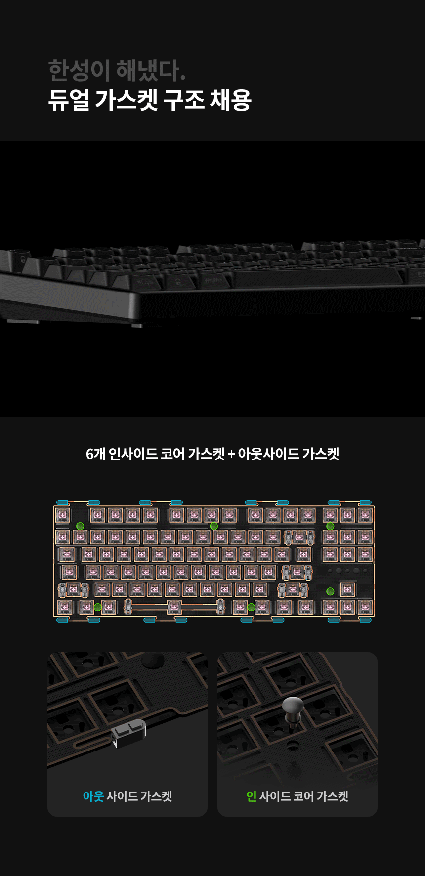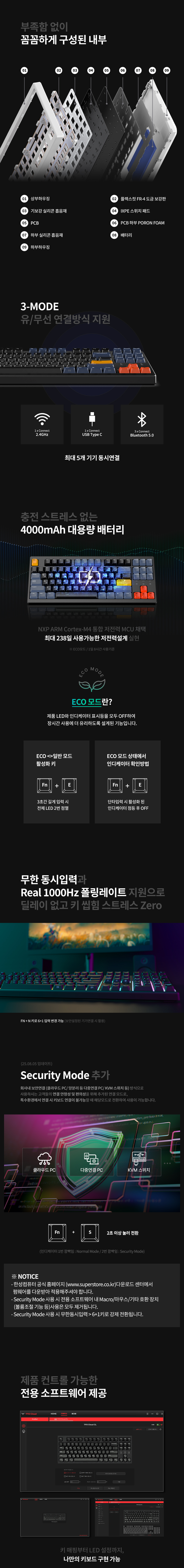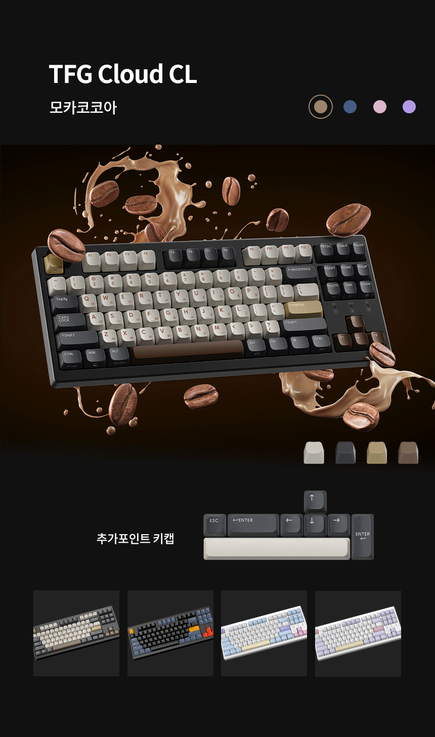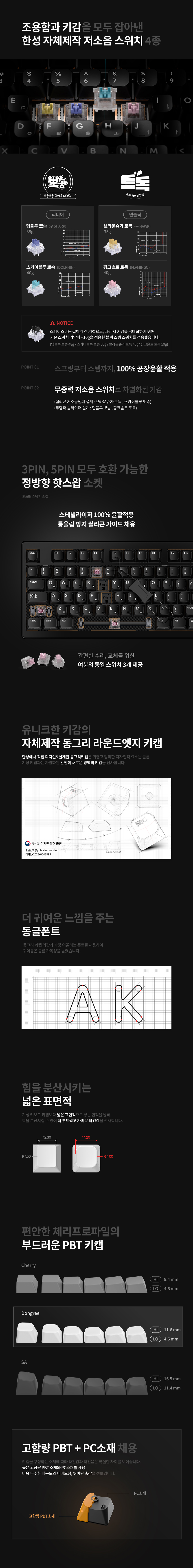 - 타입 : 듀얼 가스켓 기계식키보드 - 규격 : 87키 텐키리스 - 연결방식 : 유선 USB Type C / 무선 2.4GHz(리시버), Bluetooth 5.0 - 키캡 : PBT 이중사출 동그리키캡(자체제작) - 동시입력 : 무한동시입력 - 폴링레이트 : 유선 1000Hz / 2.4GHz 1000Hz / Bluetooth 125Hz - 스위치 : 리니어 - 딥블루 뽀송 38g, 스카이블루 뽀송 40g / 넌클릭 - 브라운슈가 토독 35g, 핑크솔트 토독 40g - 핫스왑 : 3pin, 5pin 호환 가능(Kailh 스위치 소켓) - 사이즈 : 360 x 145 x 19mm - 무게 : 1000g±10g - 케이블 길이 : 1.8m - 색상 : Purple Heart / Cotton Candy / Venus Navy / Mocha Cocoa | 0원 |