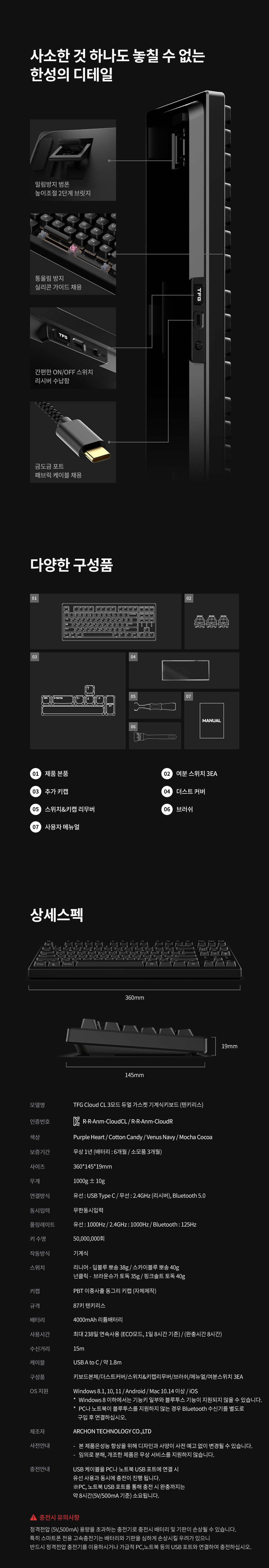 | 품명 및 모델명 | TFG Cloud CL 3모드 듀얼 가스켓 기계식키보드 | 제조사(수입자/병행수입) | (주)한성 |