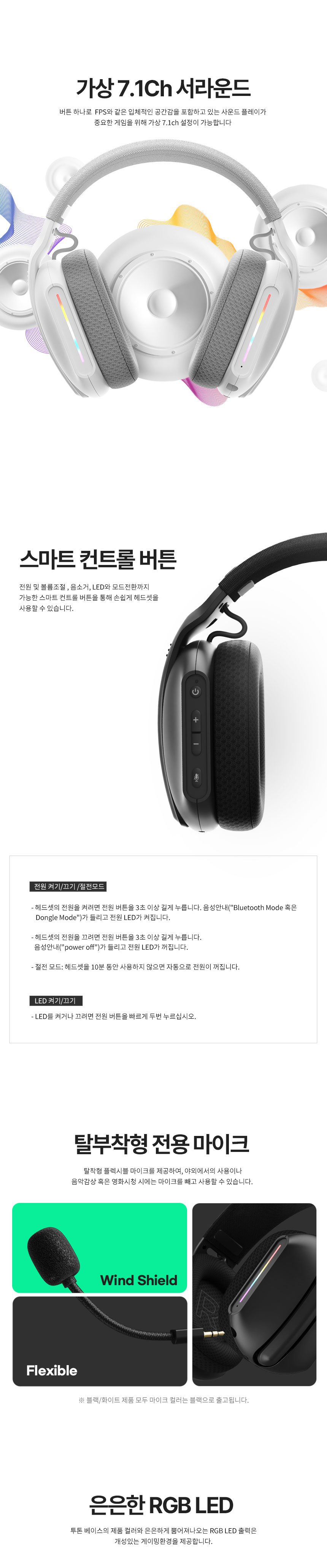 - 채널 : 가상 7.1ch 서라운드 - LED : RAINBOW RGB LED - 드라이버 규격 : 40mm - 임피던스 : 20Ω±3Ω - 배터리 : 1000mAh 리튬 폴리머 - 사용시간 : LED OFF : 32시간 / LED ON : 20시간 - 수신거리 : 최대 10m - 주파수 : 20HZ - 20KHZ - 연결방식 : 무선연결-2.4GHz리시버,블루투스5.2 / 유선연결-3.5mm AUX(4극단자) - 연결형태 : 전용 USB TypeC 리시버 제공 (USB TypeA 전환커넥터 추가제공) - 무게 : 225g - 크기 : 220 x 220 x 97mm - 색상 : 블랙/화이트 | 0원 |