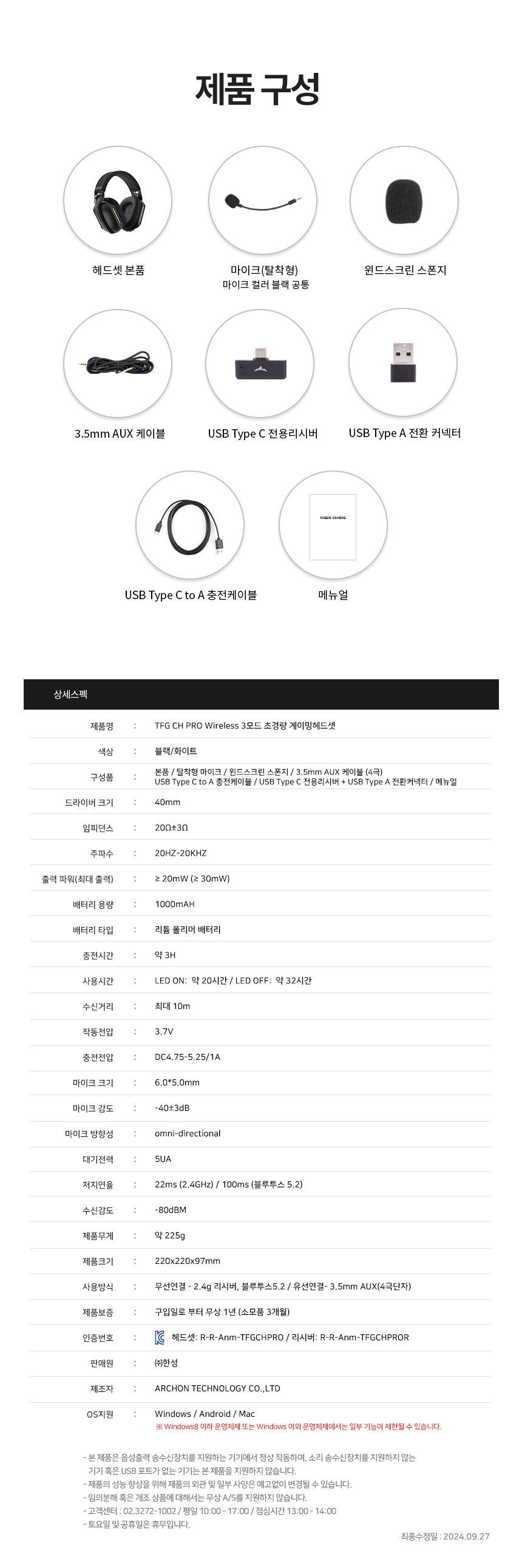| KC인증필 항목 | 헤드셋 : R-R-Anm-TFGCHPRO / 리시버 : R-R-Anm-TFGCHPROR | 상품 가로_세로_높이 | 상품상세정보 참조 |