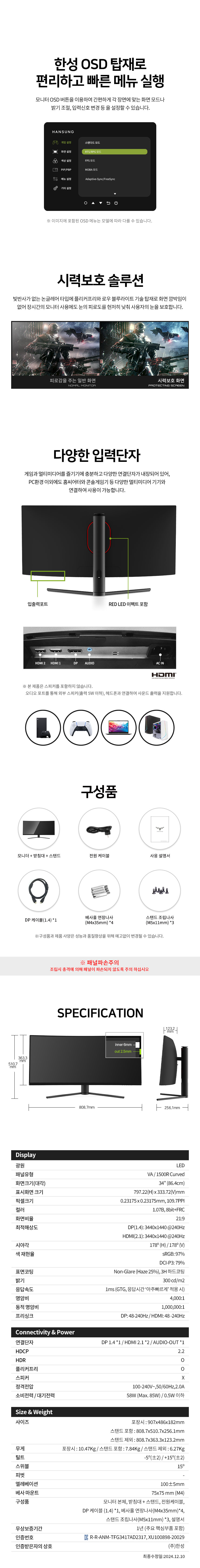 - 86.4cm(34인치) / 울트라와이드(21:9) / 커브드(1500R) - 3440 x 1440 (WQHD) / 픽셀피치: 0.231mm / 240Hz / 1ms - 300cd / 4,000:1 / 1,000,000:1 / 플리커 프리 / 눈부심 방지 - 논글레어 / 헤드폰 아웃 / HDCP 지원 / HDR 지원 / 무결점 정책 / 틸트(상하),스위블(좌우),높낮이, - 베사홀: 75 x 75mm / 58W / 0.5W - 크기(가로x세로x깊이): 809x511x256mm / 7.84kg - [색상영역] sRGB: 97% / DCI-P3: 79% - [게임특화] FreeSync / G-Sync compatible - [단자정보] HDMI / DP | 0원 |