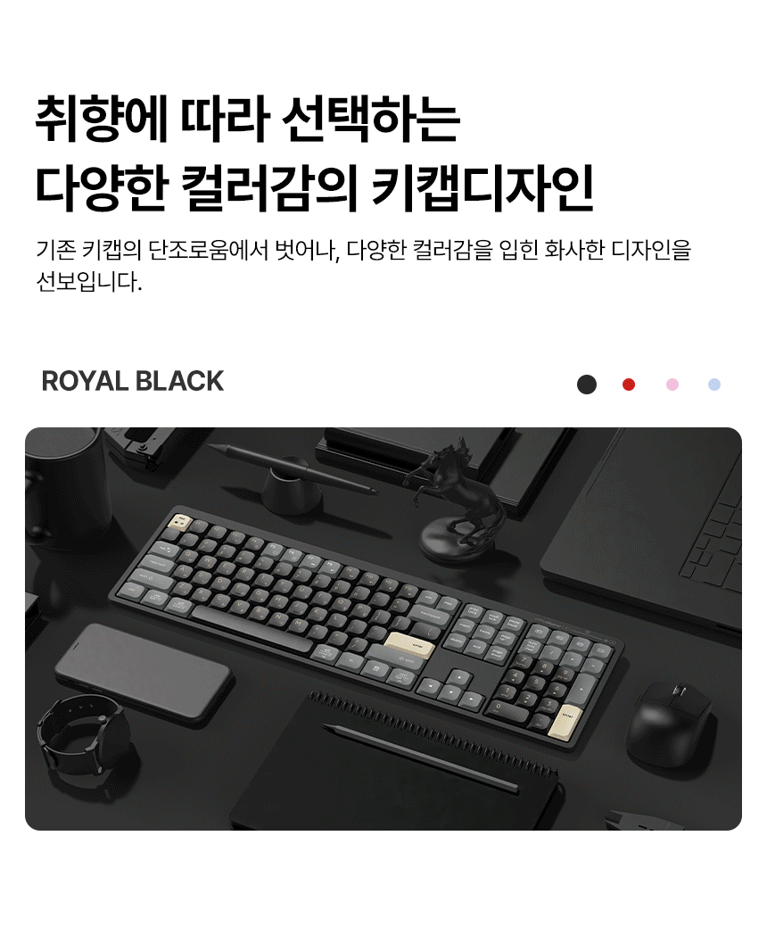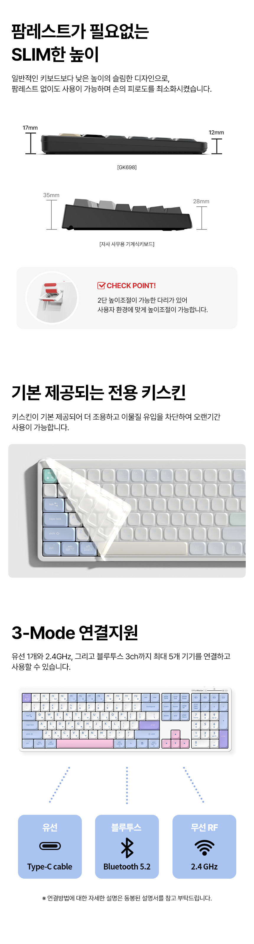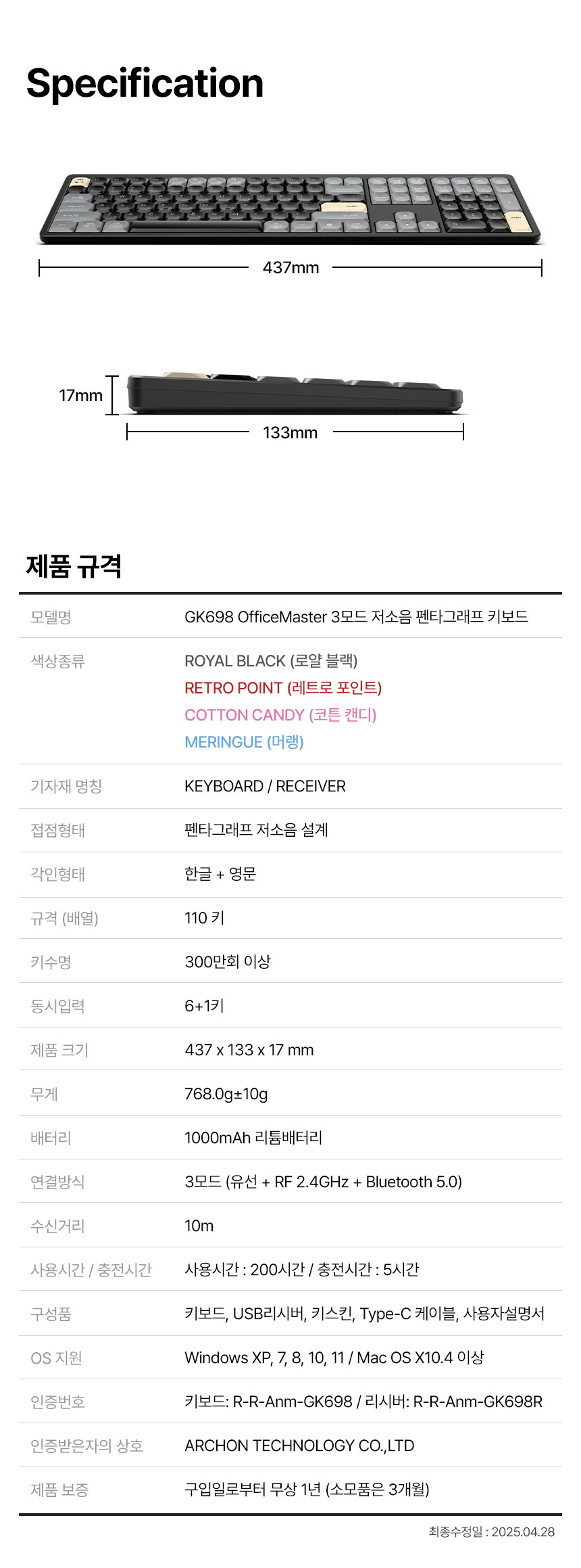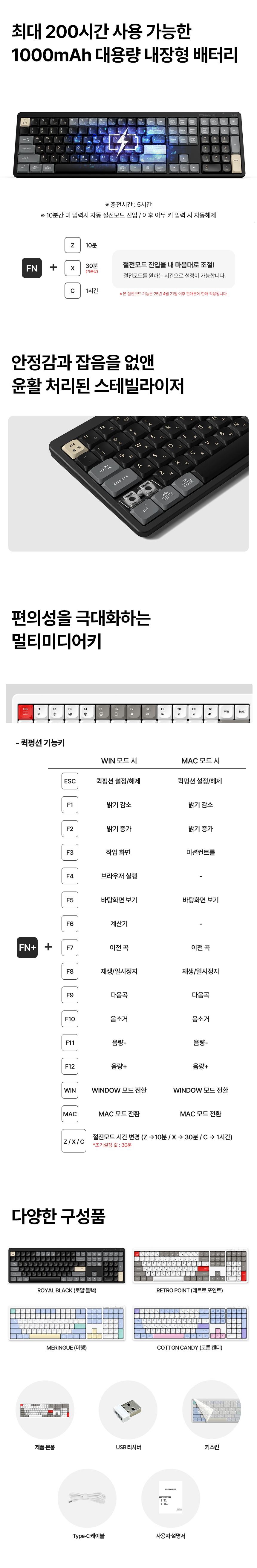 - 접점형태 : 펜타그래프 - 규격 : 110키 풀배열 - 연결방식 : RF 2.4GHz / Bluetooth5.2 / 유선 - 배터리 : 1000mAH 리튬베터리 - 폴링레이트 : 1000Hz - 구성품 : 키보드 본체 / USB 리시버 / 키스킨 / Type-C 케이블 / 사용자설명서 - 사이즈 : 437 x 133 x 17mm - 무게 : 768g ± 10g - 수신거리 : 10m - 사용시간 : 200시간 - 충전시간 : 5시간 - 색상 : Retro Point / Cotton Candy / Meringue / Royal Black | 0원 |