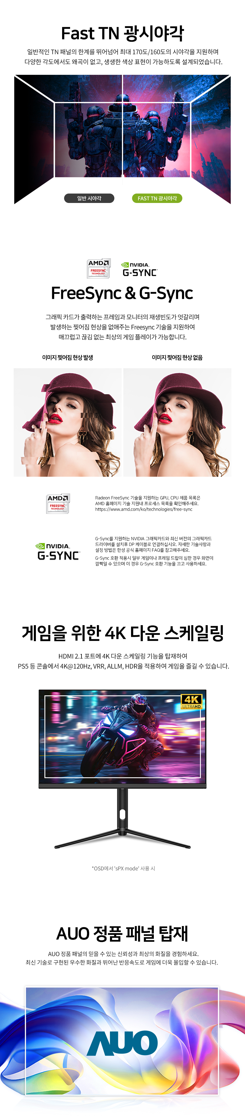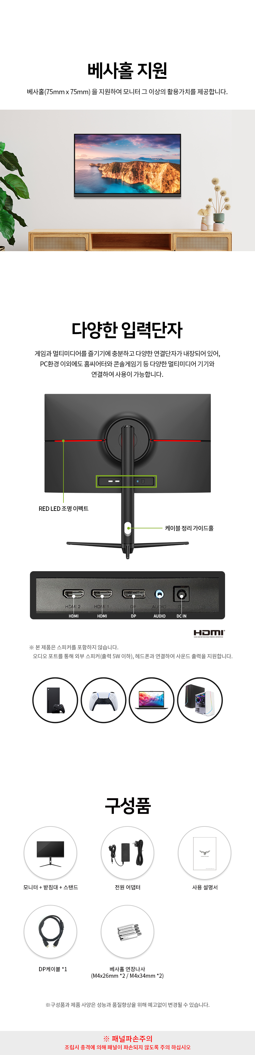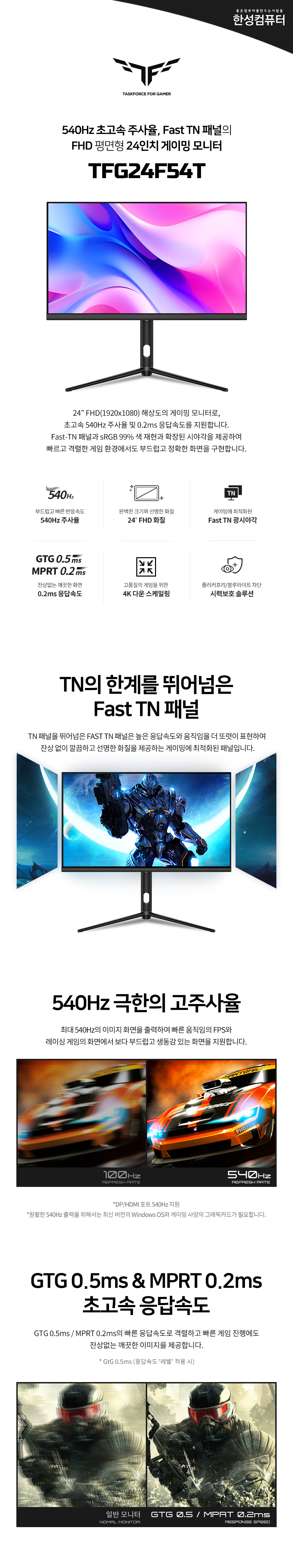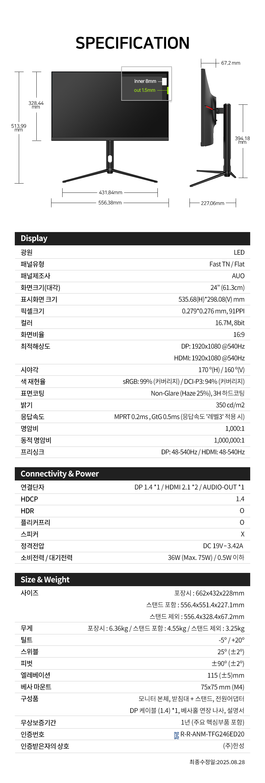 - 일반/무결점 선택가능 - 61.3cm(24인치) / 와이드(16:9) / FastTN / 평면 - 1920 x 1080(FHD) / 픽셀피치: 0.279mm / 540Hz / 0.2ms(MPRT) - 350cd / 1,000:1 / 1,000,000:1 / 플리커 프리 / 블루라이트 차단 / 논글레어 - 다운스케일링 / 헤드폰 아웃 / HDCP 지원 / 틸트,스위블,피벗,엘레베이션 / 베사홀: 75 x 75mm / 36W - 크기(가로x세로x깊이): 527x404x170mm / 3.2kg - [색상영역] sRGB: 99% - [게임특화] FreeSync / G-Sync - [단자정보] HDMI 2.1 / DP 1.4 | 0원 |