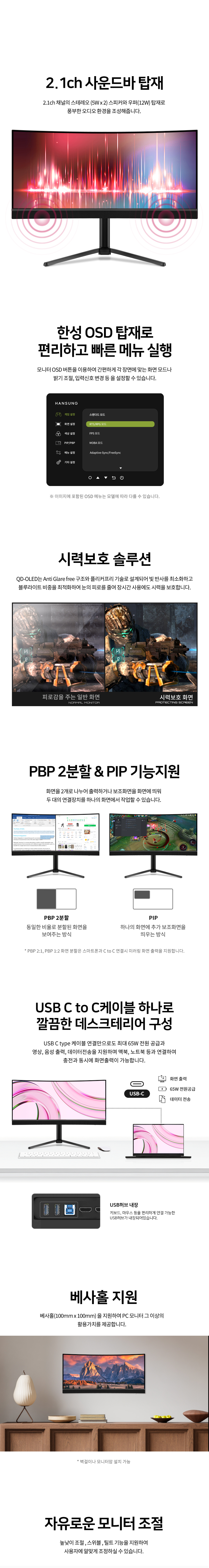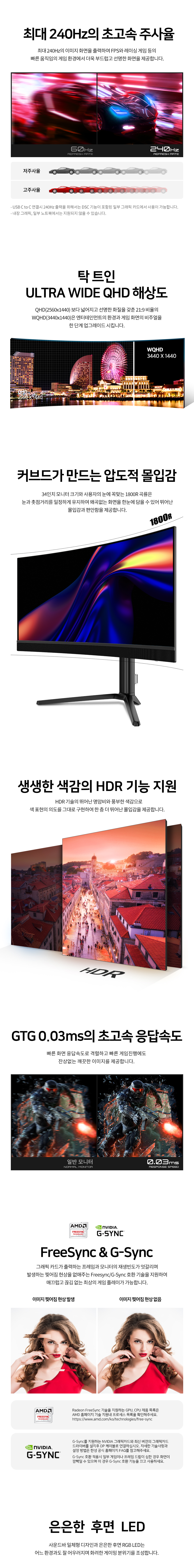 - 86.4cm(34인치) / QD-OLED / 울트라와이드(21:9) / 커브드(1800R) - 3440 x 1440 (WQHD) / 픽셀피치: 0.2315mm / 240Hz / 0.03ms - 1000cd / 1,500,000:1 / 플리커 프리 / 눈부심 방지 - 안티글레어 / 헤드폰 아웃 / HDCP 지원 / HDR 지원 / 무결점 정책 / 틸트(상하),스위블(좌우),높낮이, - 베사홀: 100 x 100mm / 60W / 0.5W - 크기(가로x세로x깊이): 813x306x596mm / 8.5kg - [색상영역] sRGB: 100% / DCI-P3: 99.3% - [게임특화] FreeSync / G-Sync compatible - [단자정보] HDMI / DP /USB Type C / USB Type A / USB Type B | 0원 |