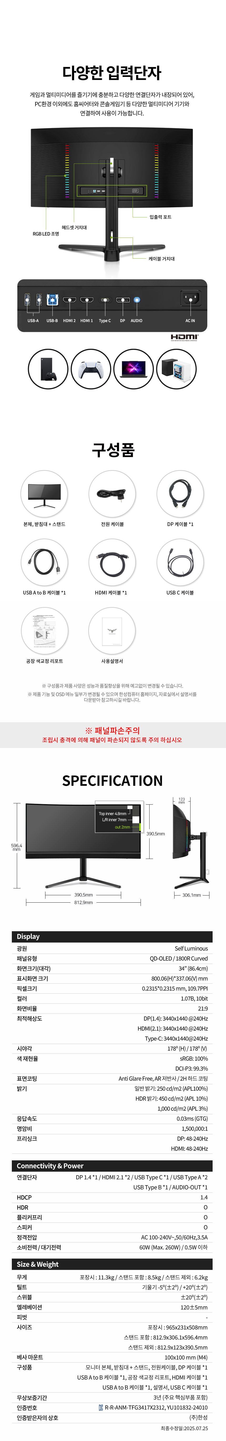 | 품명 및 모델명 | TFG34Q24WL QD-OLED | 제조사(수입자/병행수입) | (주)한성 |