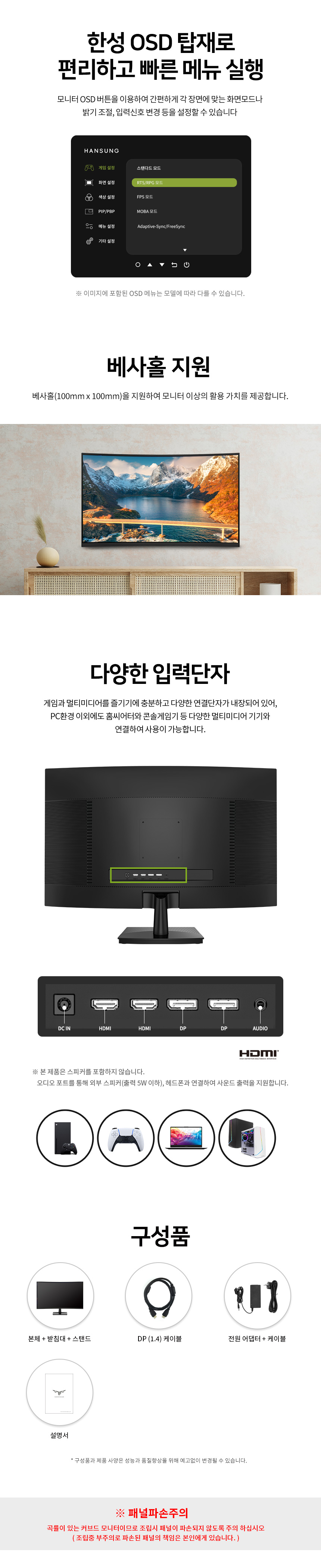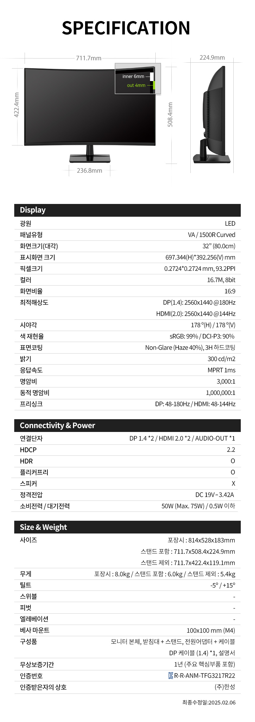- 80cm(32인치) / 와이드(16:9) / VA / 커브드 / 1500R / 광시야각 - 2560 x 1440(QHD) / 픽셀피치: 0.2724mm / 180Hz / 1ms(MPRT) - 300cd / 3,000:1 / 1,000,000:1 / 플리커 프리 / 블루라이트 차단 - 눈부심 방지 / 논글레어 / PBP / PIP / 헤드폰 아웃 - HDCP 지원 / 무결점 정책 / 틸트(상하) / 베사홀: 100 x 100mm - 50W / 0.5W 이하 / 크기(가로x세로x깊이): 616x453x196mm / 6.99kg - [색상영역] sRGB: 99% / DCI-P3: 90% - [게임특화] 게임모드 지원 / 조준선 표시 / FreeSync / G-Sync compatible / Adaptive Sync - [단자정보] HDMI / HDMI 2.0 / DP 1.4 | 0원 |