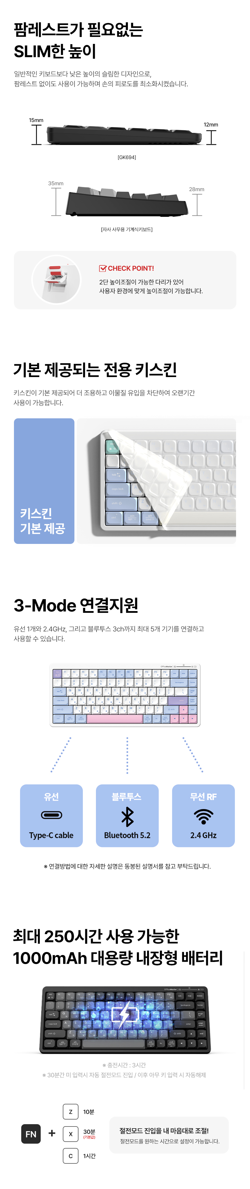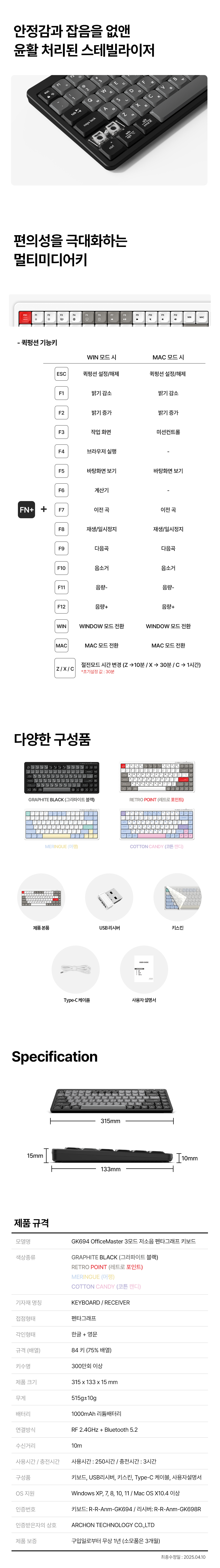 - 접점형태 : 펜타그래프 - 규격 : 84키 (75%배열) - 연결방식 : RF 2.4GHz / Bluetooth5.2 / 유선 - 배터리 : 1000mAH 리튬베터리 - 폴링레이트 : 1000Hz - 구성품 : 키보드 본체 / USB 리시버 / 키스킨 / Type-C 케이블 / 사용자설명서 - 사이즈 : 315 x 133 x 15mm - 무게 : 515g ± 10g - 수신거리 : 10m - 사용시간 : 250시간 - 충전시간 : 3시간 - 색상 : Retro Point / Cotton Candy / Meringue / Graphite Black | 0원 |