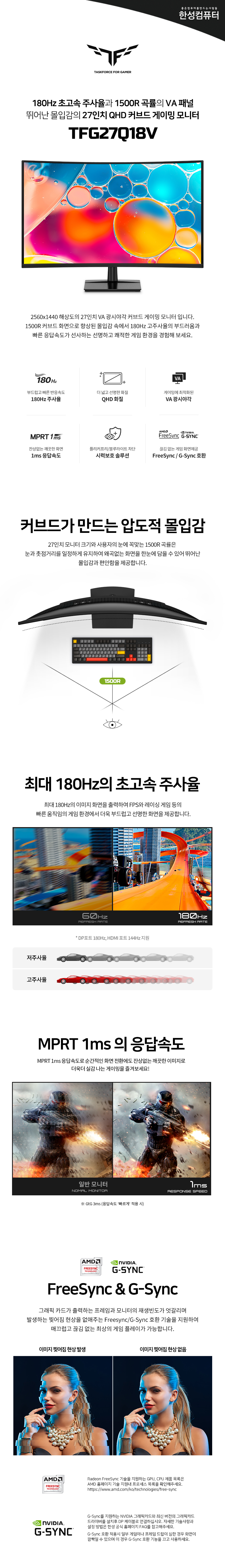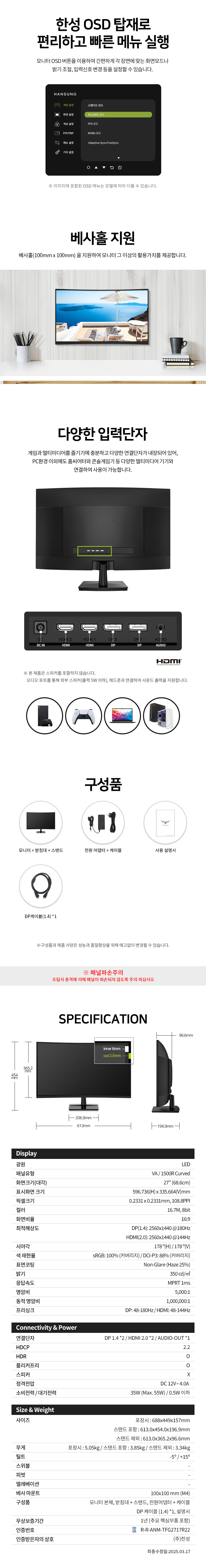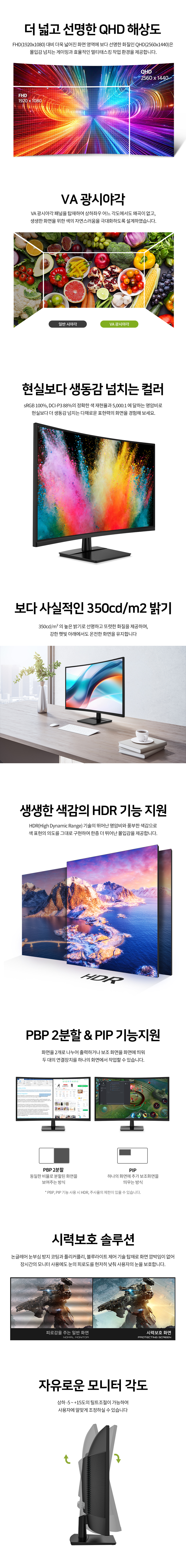 - 일반/무결점 선택가능 - 68.6cm(27인치) / 와이드(16:9) / VA / 커브드 / 1500R - 2560 x 1440(QHD) / 픽셀피치: 0.2331mm / 180Hz / 1ms(MPRT) / PBP / PIP - 350cd / 1,000,000:1/ 플리커 프리 / 블루라이트 차단 / 눈부심 방지 - 논글레어 / HDCP 지원 / 무결점 정책 / 베사홀: 100 x 100mm / 35W - 틸트(상하) - 크기(가로x세로x깊이): 613x454x197mm - [색상영역] sRGB: 100% / DCI-P3: 88% - [게임특화] FreeSync / G-Sync compatible / Adaptive Sync - [단자정보] HDMI 2.0 / DP 1.4 | 0원 |