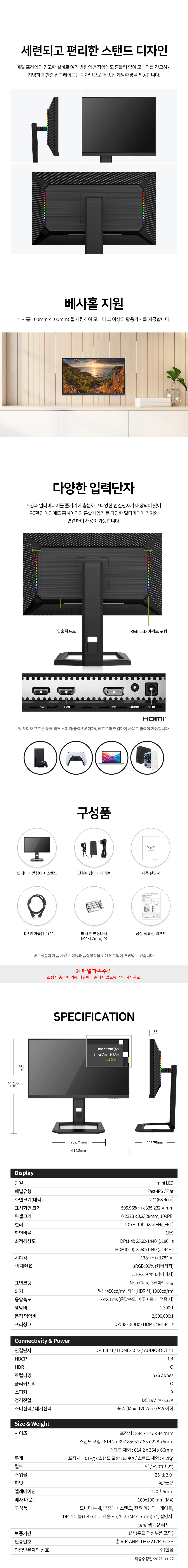 - 일반/무결점 선택가능 - 68.4cm(27인치) / 와이드(16:9) / Fast IPS / miniLED / 평면 / 광시야각 - 2560 x 1440(QHD) / 픽셀피치: 0.2328mm / 180Hz / 1ms(GTG) / PBP / PIP - 1000cd / 1,300:1 / 2,500,000:1 / 블루라이트 차단 / 눈부심 방지 - 논글레어 / HDCP 지원 / 무결점 정책 / 베사홀: 100 x 100mm / 55W - 피벗(회전) / 엘리베이션(높낮이) / 틸트(상하) / 스위블(좌우) - 크기(가로x세로x깊이): 614x399~519x229mm / 6.6kg - [색상영역] sRGB: 99% / DCI-P3: 97% - [게임특화] FreeSync / G-Sync compatible / Adaptive Sync - [단자정보] HDMI 2.0 / DP 1.4 | 0원 |