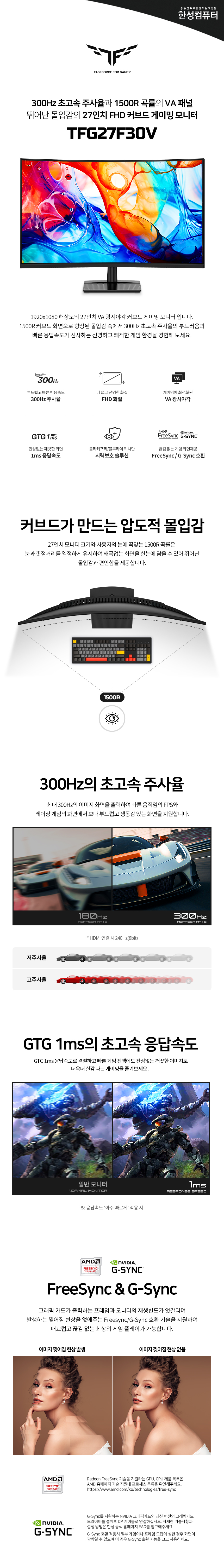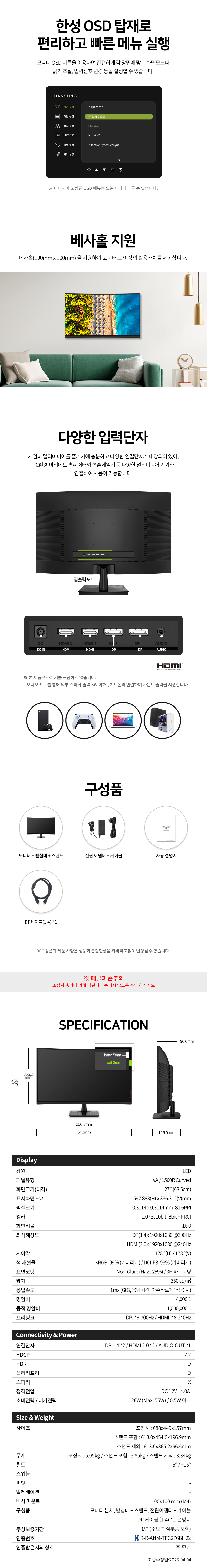 - 일반/무결점 선택가능 - 68.6cm(27인치) / 와이드(16:9) / VA / 1500R 커브드 / 광시야각 - 1920 x 1080(FHD) / 픽셀피치: 0.3114mm / 300Hz / 1ms(GTG) - 350cd / 4,000:1 / 1,000,000:1 / 플리커 프리 / 블루라이트 차단 / 눈부심 방지 - 논글레어 / 헤드폰 아웃 / HDCP 지원 / 틸트(상하) / 베사홀: 100 x 100mm / 28W - 크기(가로x세로x깊이): 613x454x197mm / 3.85kg - [색상영역] sRGB: 99% DCI-P3: 93% - [게임특화] FreeSync / Gsync - [단자정보] HDMI 2.0 / DP 1.4 | 0원 |