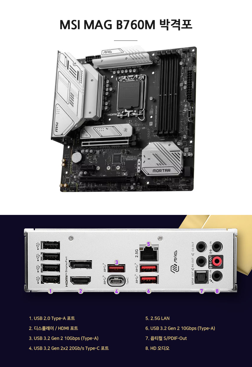 MSI / 인텔(소켓1700) / 인텔 B760 / M-ATX (24.4x24.4cm) / 전원부: 12+1+1페이즈 / 페이즈당75A / Vcore출력합계: 900A / 메모리 DDR5 / 7800MHz (PC5-62400) / 4개 / 메모리 용량: 최대 256GB / XMP3.0 / 확장슬롯 VGA 연결: PCIe5.0 x16 / PCIe버전: PCIe5.0, PCIe3.0 / PCIex16: 1개 / PCIex4: 1개 / 저장장치 M.2: 3개 / SATA3: 4개 / M.2 연결: PCIe4.0, NVMe , SATA / 후면단자 HDMI / DP / USB 3.2 / USB 3.1 / USB 2.0 / RJ-45 / S/PDIF / 오디오잭 / 랜/오디오 유선랜 칩셋: Realtek 8125BG / 2.5기가비트 / RJ-45: 1개 / 오디오 칩셋: Realtek ALC897 / 7.1채널(8ch) / 내부I/O I/O 헤더: USB 3.0 헤더 , USB 2.0 헤더 , USB3.1 Type C 헤더, RGB 12V 4핀 헤더 , ARGB 5V 3핀 헤더 , TPM 헤더 / 시스템팬 4핀: 4개 / USB2.0 헤더: 2개 / USB3.0 헤더: 1개 / 특징 전원부 방열판 / SPS(DrMOS) / M.2 히트싱크 / UEFI | 0원 |