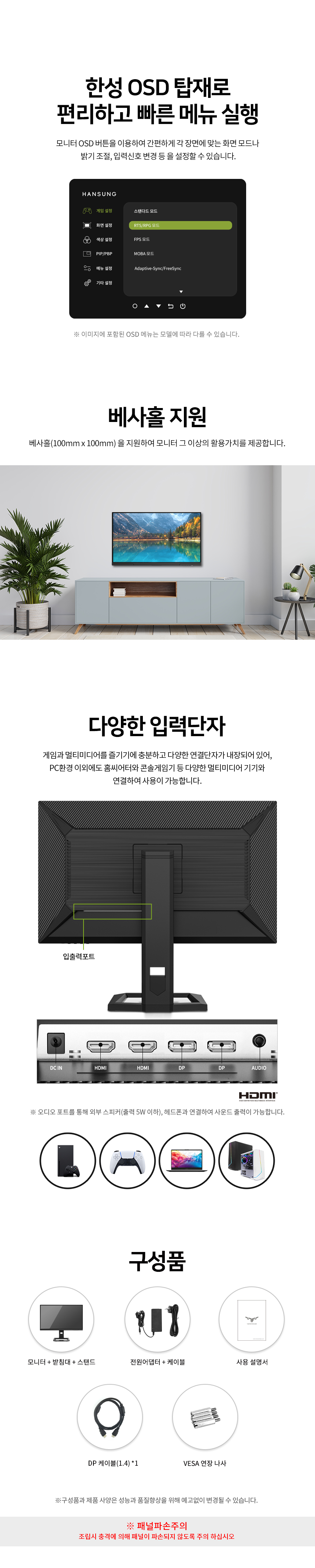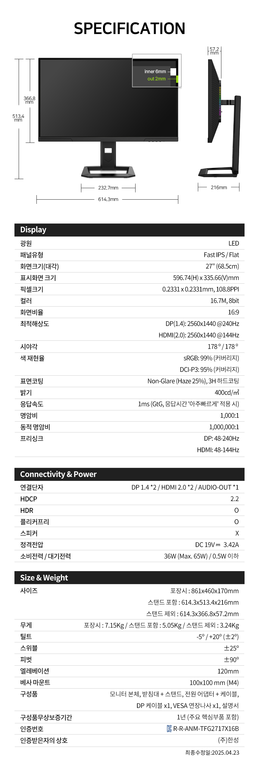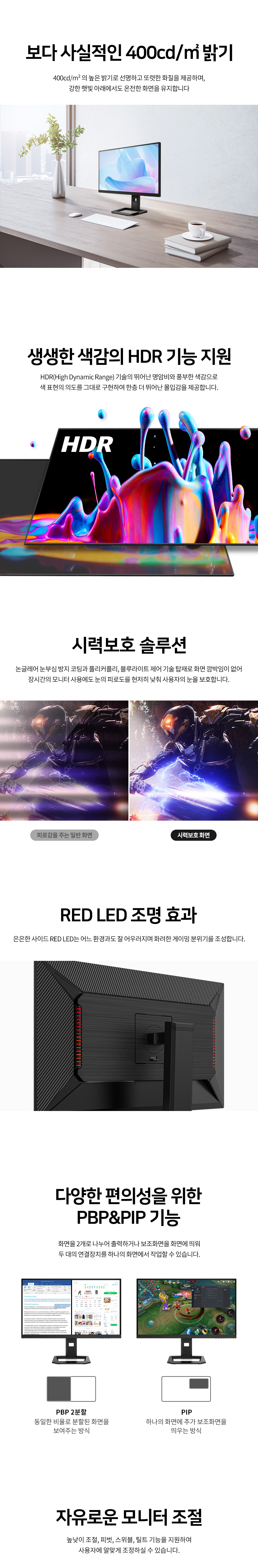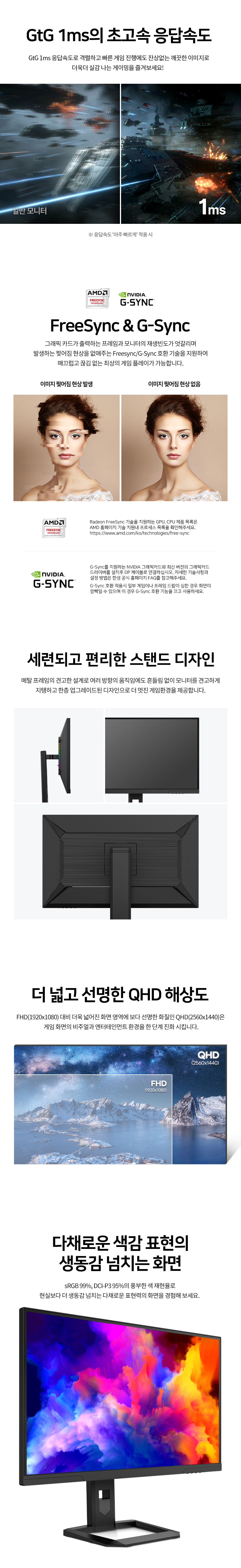 - 일반/무결점 선택가능 - 68.47cm(27인치) / 와이드(16:9) / Fast IPS / 평면 / 광시야각 - 2560 x 1440(QHD) / 픽셀피치: 0.2331mm / 240Hz / 1ms(GTG) / PBP / PIP - 400cd / 1,000:1 / 1,000,000:1 / 플리커 프리 / 블루라이트 차단 / 눈부심 방지 - 논글레어 / HDCP 지원 / 무결점 정책 / 베사홀: 100 x 100mm / 36W - 피벗(회전) / 엘리베이션(높낮이) / 틸트(상하) / 스위블(좌우) - 크기(가로x세로x깊이): 613x534mm / 5.05kg - [색상영역] sRGB: 99% / DCI-P3: 95% - [게임특화] 게임모드 지원 / FreeSync / G-Sync compatible / Adaptive Sync - [단자정보] HDMI 2.0 / DP 1.4 | 0원 |