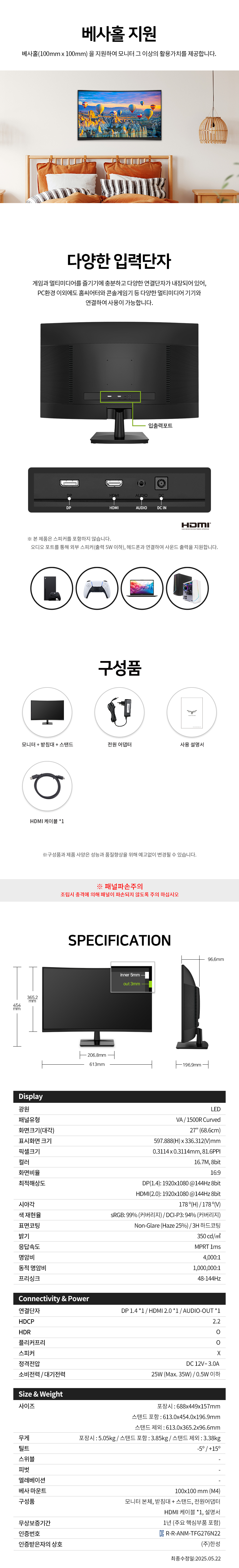 - 일반/무결점 선택가능 - 68.6cm(27인치) / 와이드(16:9) / VA / 1500R 커브드 / 광시야각 - 1920 x 1080(FHD) / 픽셀피치: 0.3114mm / 144Hz / 1ms(MPRT) - 350cd / 4,000:1 / 1,000,000:1 / 플리커 프리 / 블루라이트 차단 / 눈부심 방지 - 논글레어 / 헤드폰 아웃 / HDCP 지원 / 틸트(상하) / 베사홀: 100 x 100mm / 25W - 크기(가로x세로x깊이): 613x454x197mm / 3.85kg - [색상영역] sRGB: 99% DCI-P3: 94% - [게임특화] FreeSync / Gsync - [단자정보] HDMI 2.0 / DP 1.4 | 0원 |