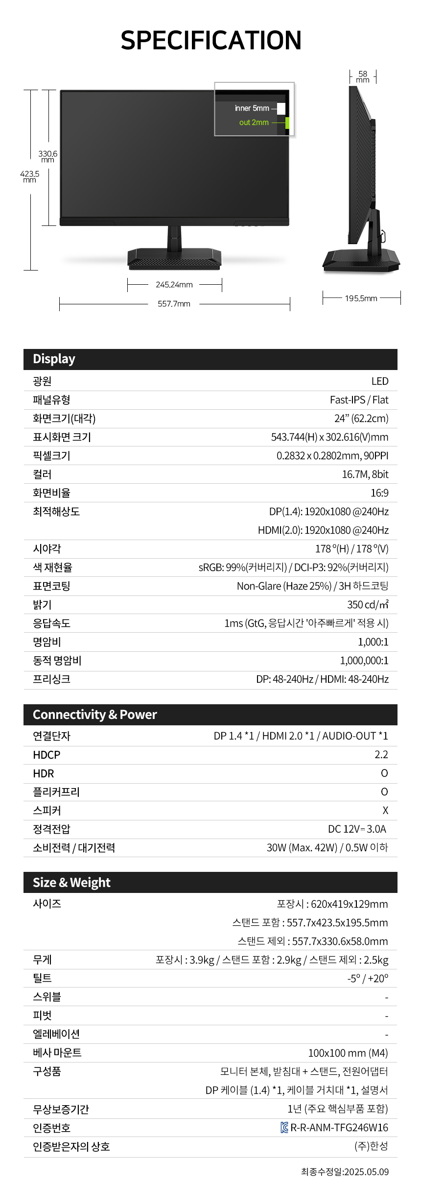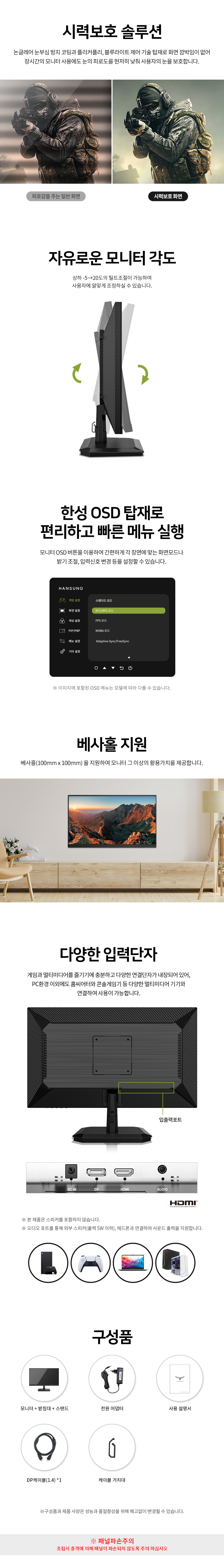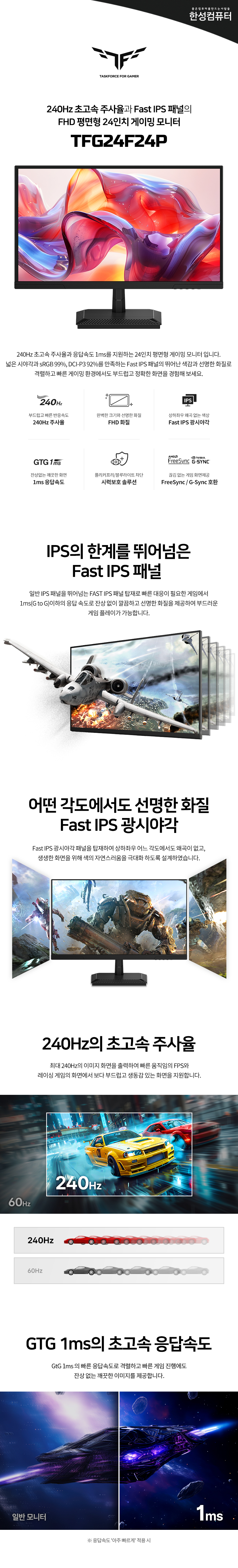 - 일반/무결점 선택가능 - 62.2cm(24인치) / 와이드(16:9) / FastIPS / 평면 - 1920 x 1080(FHD) / 픽셀피치: 0.2802mm / 240Hz / 1ms(GTG) - 350cd / 1,000:1 / 1,000,000:1 / 플리커 프리 / 블루라이트 차단 / 논글레어 - 헤드폰 아웃 / HDCP 지원 / 틸트 / 베사홀: 100 x 100mm / 30W - 크기(가로x세로x깊이): 557x423x195mm / 3.3kg - [색상영역] sRGB: 99% / DCI-P3:92% - [게임특화] FreeSync / G-Sync - [단자정보] HDMI 2.0 / DP 1.4 | 0원 |