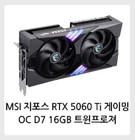 RTX 5060 Ti / PCIe5.0 / 정격파워600W 이상 / 전원 포트: 16핀(12V2x6) x1 / 가로(길이): 247mm / 베이스클럭: 2407MHz / 부스트클럭: 2647MHz / OC클럭: 2662MHz / 스트림 프로세서: 4608개 / GDDR7 / 출력단자: HDMI2.1 , DP2.1 / 지원정보: 8K 지원 , HDR 지원 , HDCP 2.3 / 사용전력: 180W / 2팬 / 두께: 51mm / 제로팬(0-dB기술) / 백플레이트 / DrMOS / 구성품: 2x8핀 to 16핀 커넥터 | 0원 |