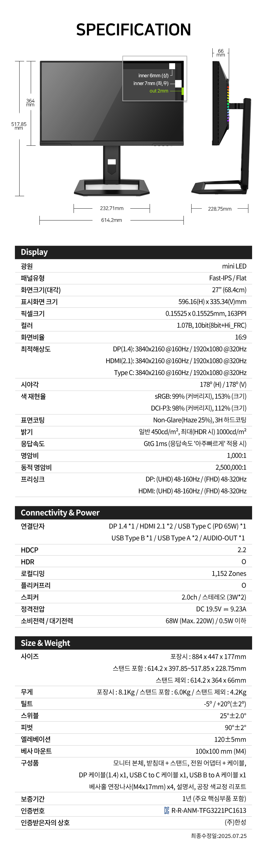 | 제품 주요 사양 | 상품상세정보참조 | 크기,무게 | 상품상세정보참조 |